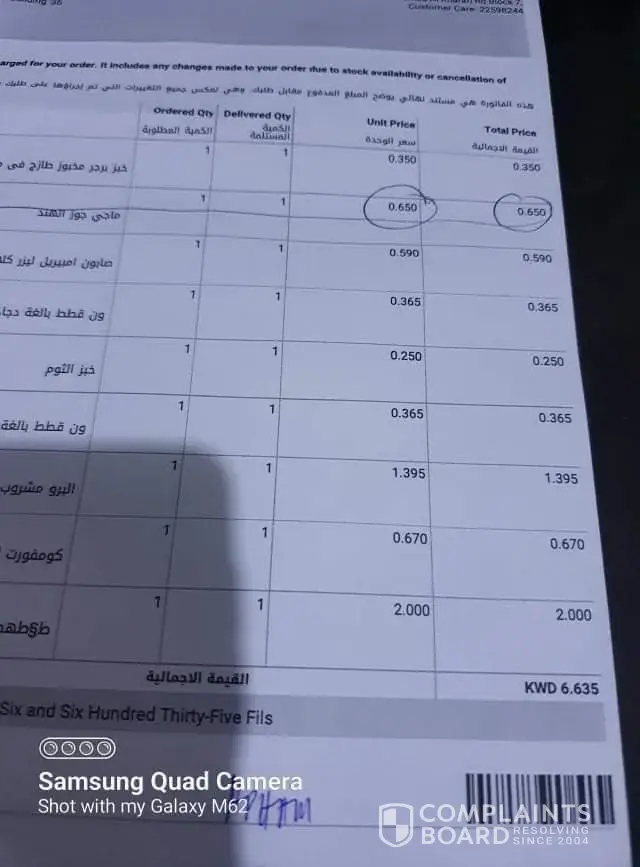 July 9, 2021 I ordered a grocery items online thru Carrefour apps. I paid KD 7.485 the invoice delivered was KD6.635 and the items was incomplete and incorrect. I tried to contact the call center but they are not answering or maybe they are out of Staff. And the delivery man was soo lazy to bring the items.