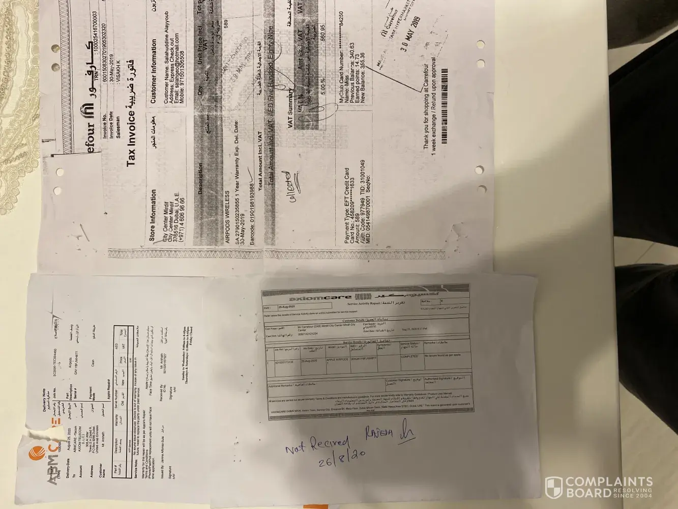 I bought the apple AirPods at 30/5/2019 and it was under one year warranty, and 12/5/2020 I faced an issue with those AirPods that people can't hear my voice so accordingly I return it to carrefour customer service to fix it, they always responding that they didn't receive it from supplier and after close follow up for almost every week either by phone call or going to customer service of mirdif city center they informed me at 31st of August 2020 that your AirPods is working perfectly, I informed them that people are not hearing me well once I used airpods for a call, I took it to try it and then realised that it is same issue and people can't hear me well once I am calling them, not only this but at the report that given to me it is mentioned that airpods sent to supplier at 25/8/2020 which is after three month from handling the airpods, and the supplier mentioned that it is out of warranty, since Seem the carrefour team not giving the airpods at the warranty time.