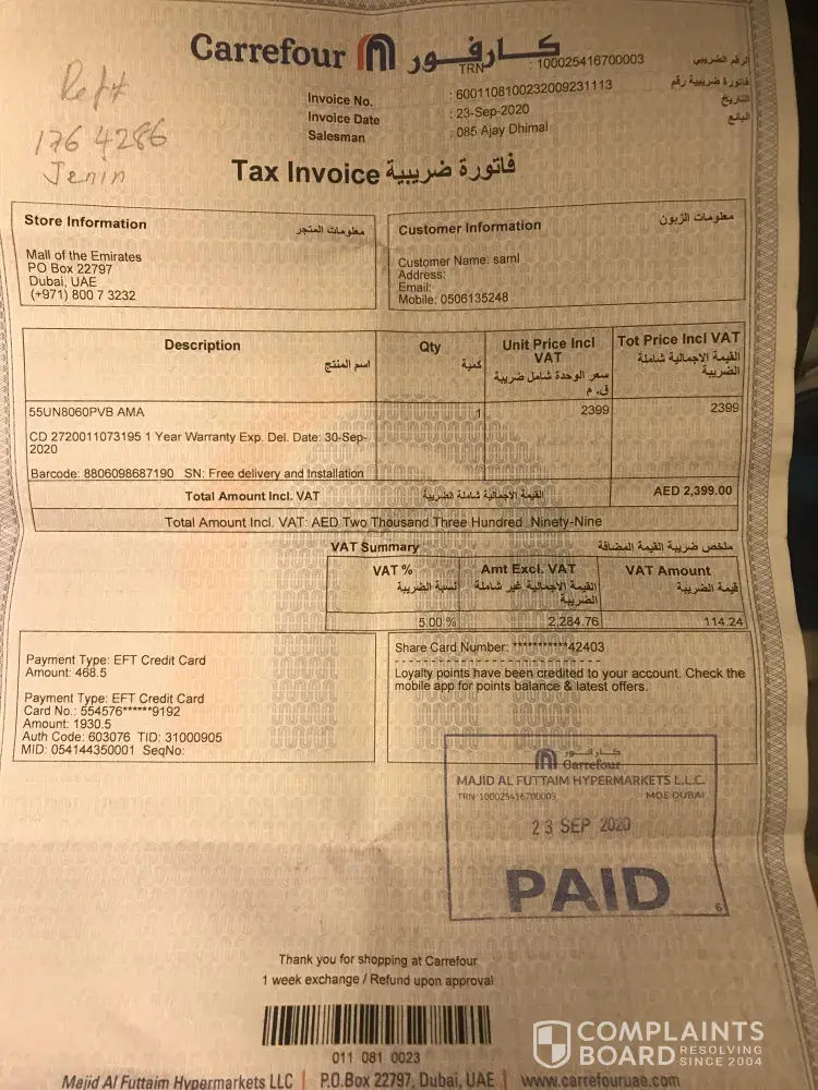 23rd september 2020, bought 55"lg tv and I was told the price includes free delivery and installation in a week. 30th september the box was delivered but was told that lg will do the installation later! I am struggling ever since and finally carrefour customer care told me it may take another week. Salesperson lied to me