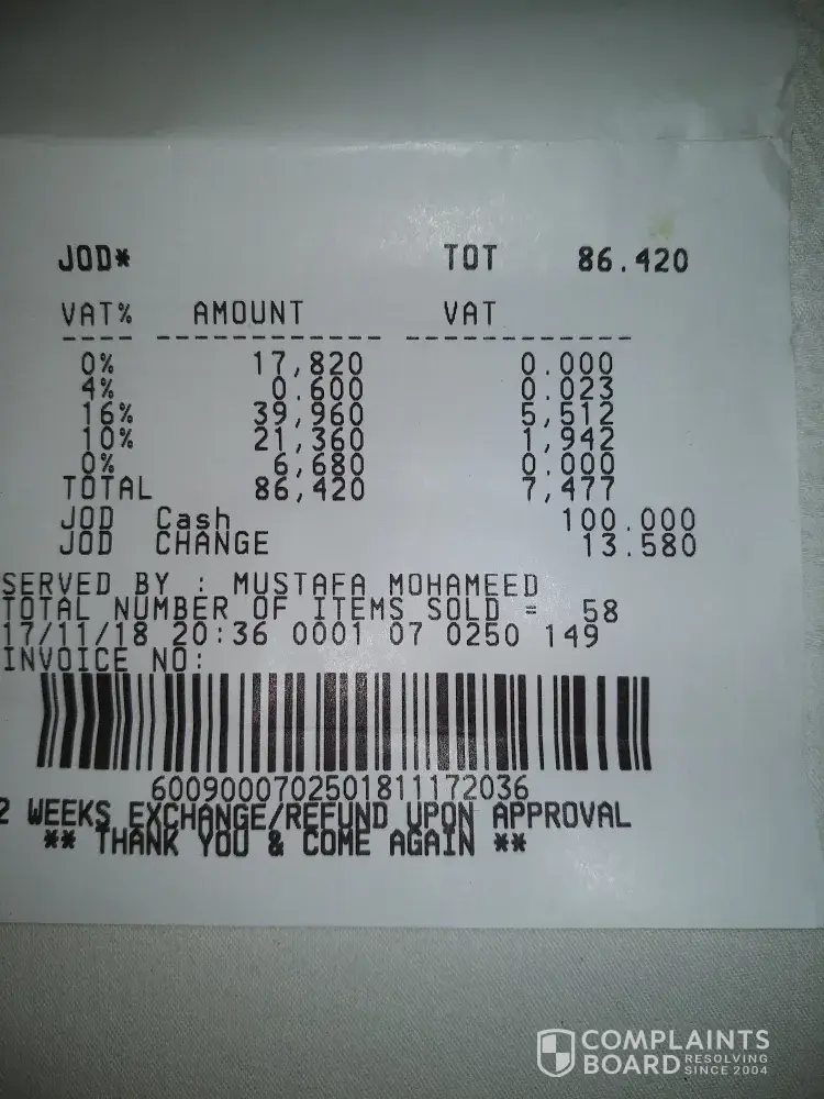 Complaint Against: Cashier (Name: Magdy) (see attached photo).