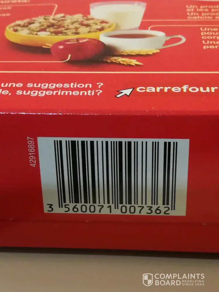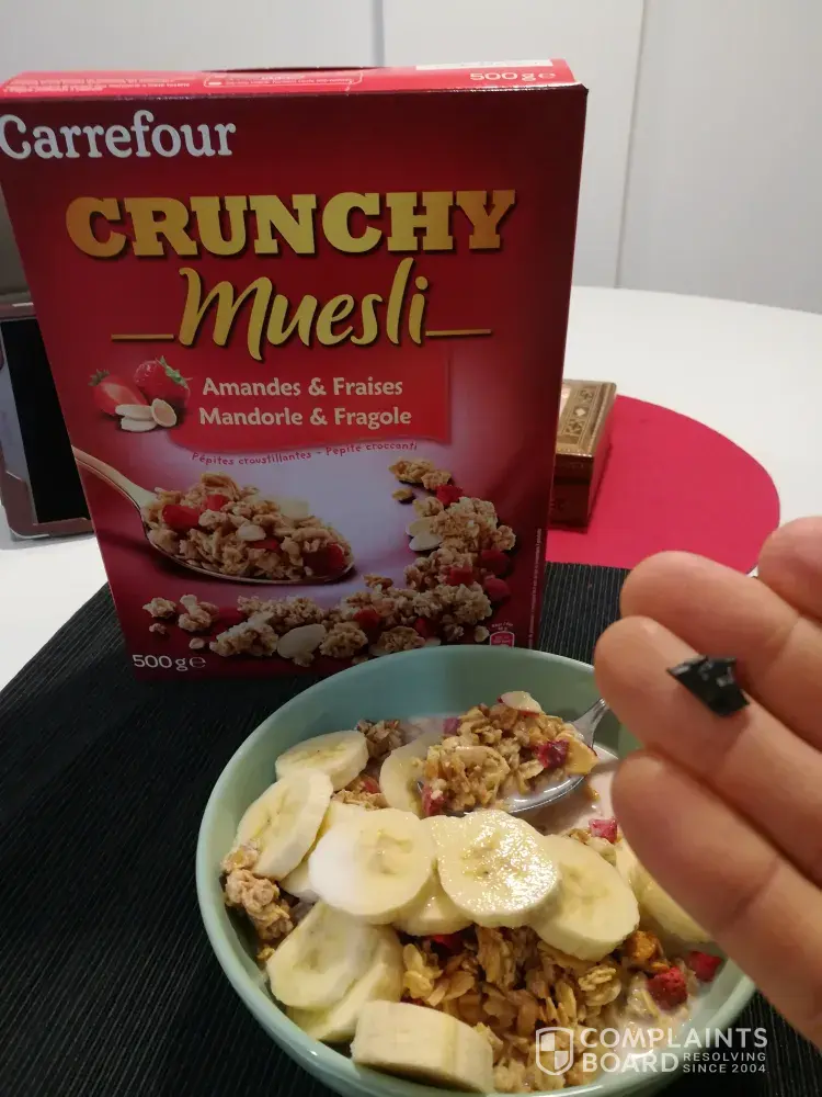 A sharp and hard peice of black plastic was found inside the sealed bag of Muesli cereal. This sharp peice of plastic was found mixed in with the cereal itself, and is obviously a very serious danger if it was chewed up and swallowed. The plastic piece itseld is triangular and about 2cm at each side. I'm posting this complaint because this peice of machinery or whatever it was that broke off and landed in my cereal could have caused a serious injury. I have very little confidence in Carrefour band products now, as well as Carrefour in general.