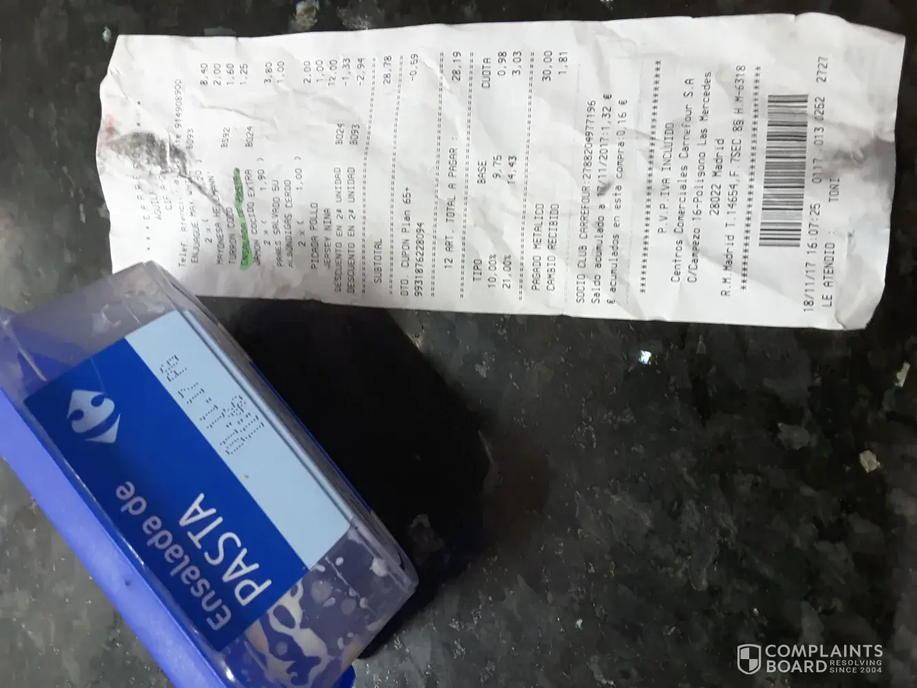 We do our food shopping on Saturday afternoon in Carrefour Aguilas Spain, in the shopping precinct. We usually buy a tub of Pasta Salad, which we enjoy with our evening meal. Today, Saturday 18th November, we were eating our meal containing the salad we had bought earlier, when we both remarked it tasted awful, not as usual. On looking at the tub it came in, we were appalled to see the expirery date was 1-11-17, 17 days out of date! The salad contains tuna, and we had already eaten quite a substantial amount of it. As the evening is going on, we are feeling very ill. For a giant supermarket chain like Carrefour, I think you will agree this is disgusting. I cannot find an email address anywhere to contact them directly.