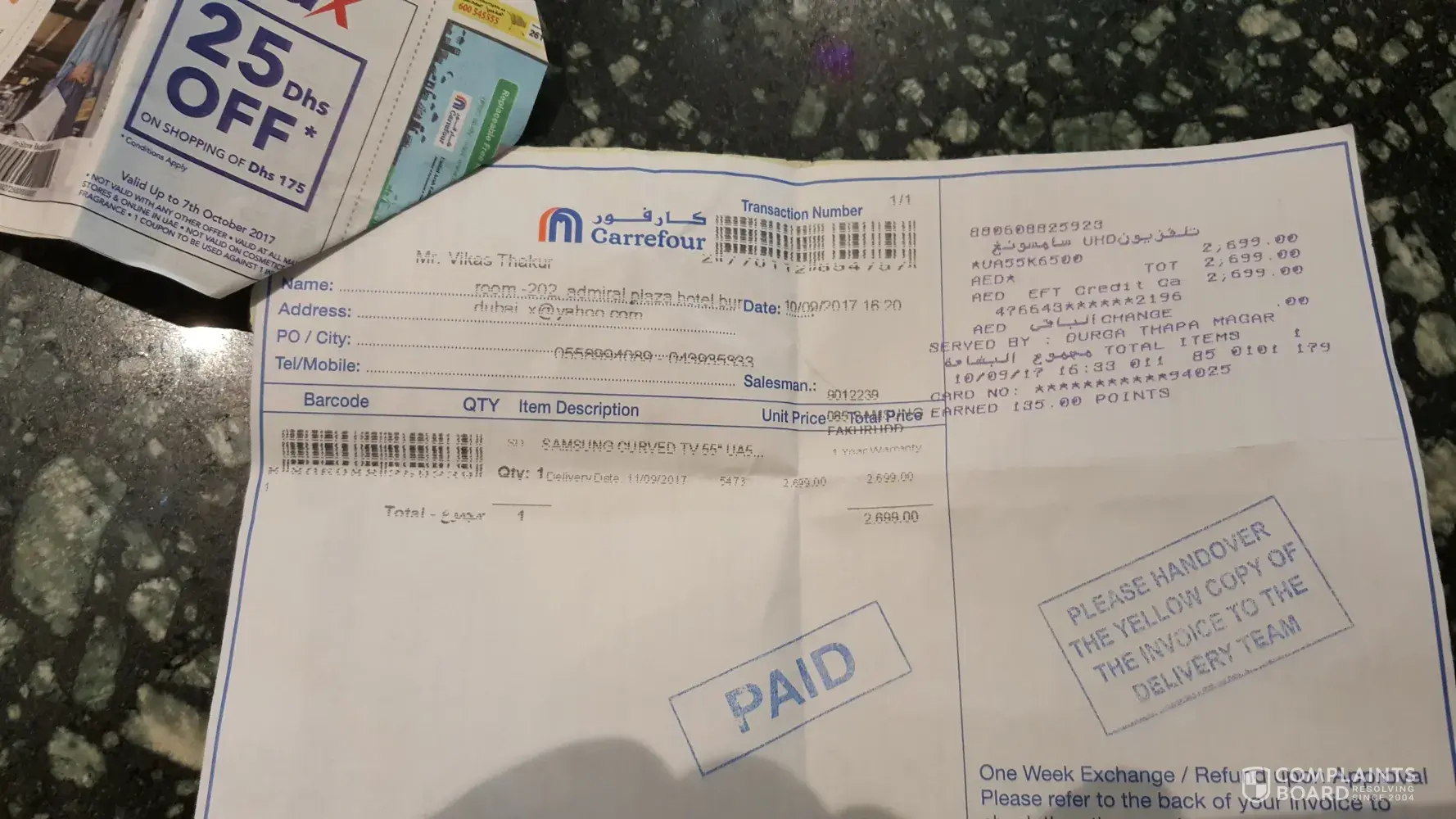 I brought a samsung 55" smart curved tv from carrefour located in mall of Emirates.( Trans no-[protected]) on 10/9/17.I made a card payment and requested them for a delivery to which they promised to be delivered next day by evening 1600 hrs.