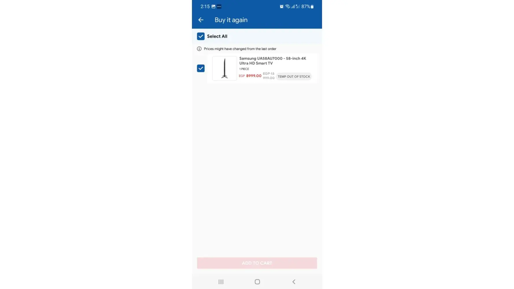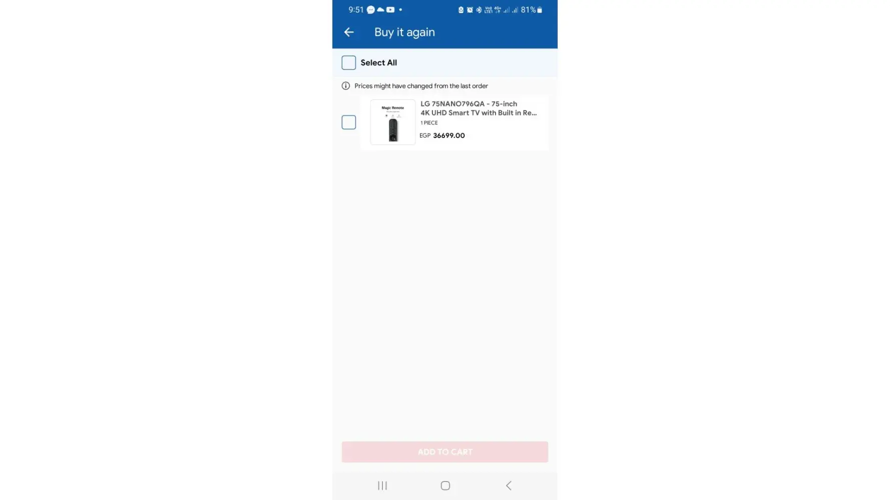 When I buy again, the offer is over. Carrefour did a very unethical action to hold the product until the price rises again after offer period. I called customer service who opened a complain but they said may be the cancellation due to out of stock. I said the TV in stock and at higher price now and Carrefour should act as an ethical company and guarantee the offer to the customer after purchasing it during offer period.