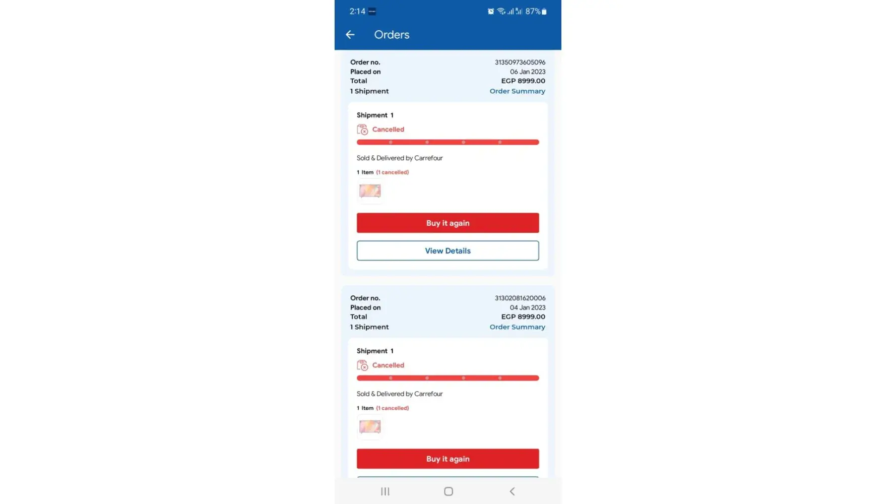 Carrefour Egypt I ordered a TV they first cancelled the order same day & asked to reorder & I did but they waited from 12 Jan till 16 Jan to cancel again on the delivery date & ask to reorder for the third time but they changed the price & when I called the holiness & asked why it was cancelled again they said because you ordered more than one time & reordered because the cancelled it