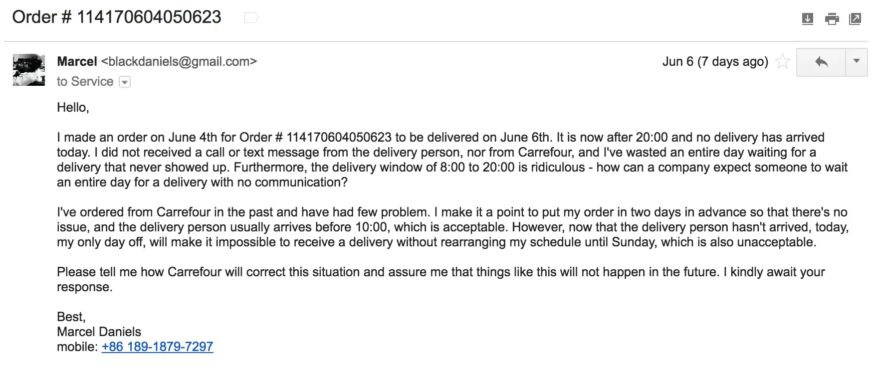 I've been dealing with a delivery ( Order # [protected] ) for over a week now and am tired of the poor customer service from Carrefour here in Shanghai. I have attached copies of the correspondence, none of which have been responded to. This is the third time delivery has been personally assurred would come by a certain time and I've wasted my valuable itme waiting for the arrival. I feel completely unvalued as a customer, and frankly, disrespected, as I warned the agent last time that I had no more faith in Carrefour's ability to make good on delivery promises and he personally guaranteed that the delivery would come on time.