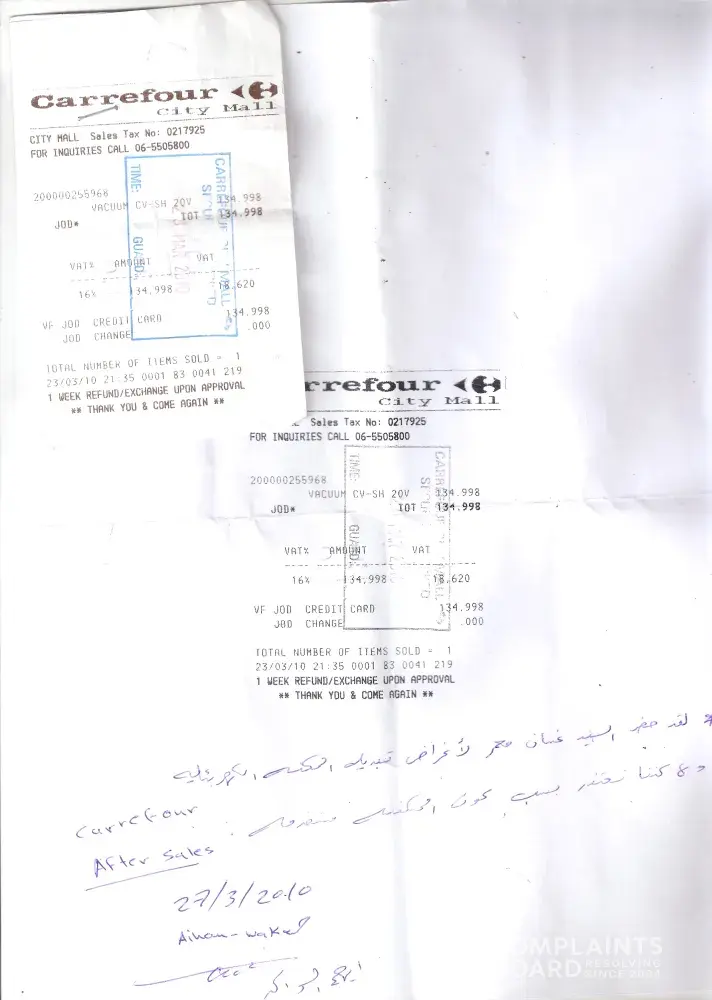 I have bought a vacuun cleaner few days ago from Carrefour at Amman/Jordan. The sales department assured upon purchase that I am entitled to replace the item orask for refund in a week's time from date of purchase. The machine for some reason didn't work properly and was shutting down every few minutes. I asked the customer care at carrefour to replace it, they simply refused, and denied that they made such a promise. I tried to contact the upper management of Carrefour in Amman but to no avail . Then I had to buy another vacuum cleaner from another dealer.