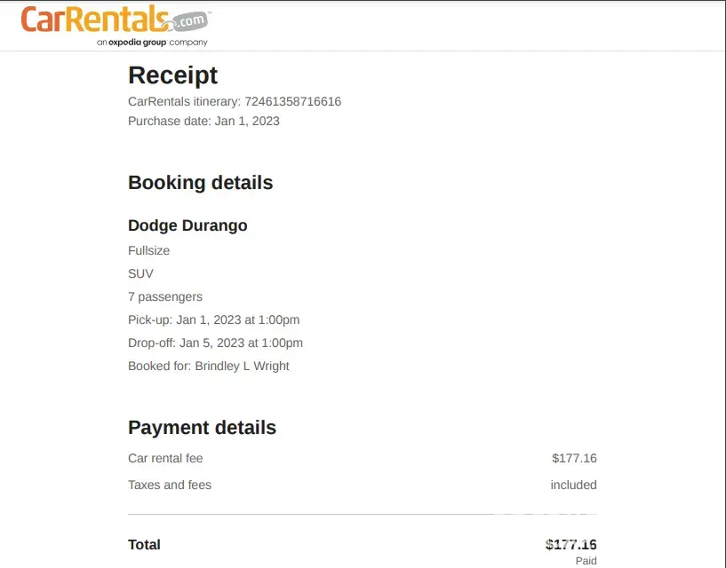 After I dropped off the vehicle I received a receipt from Thrifty Car Rental for $226.61.