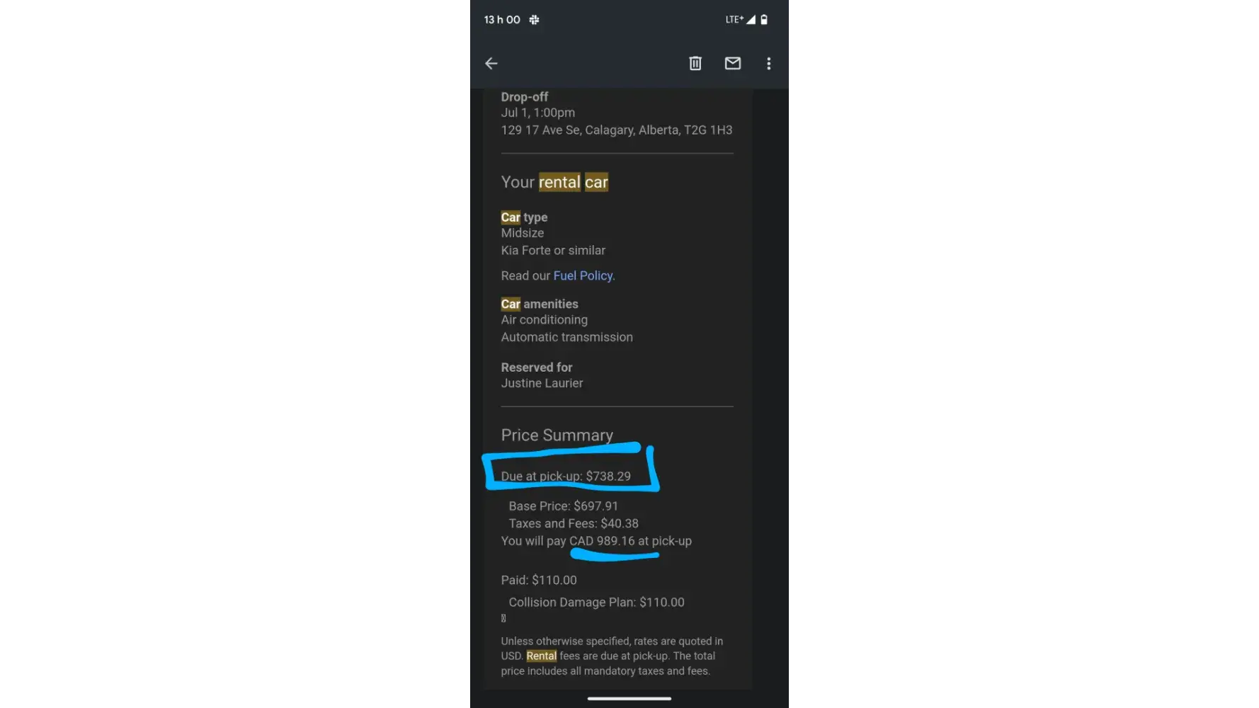 I booked online a car on the Website. At pick-up, I was surprised to see the price was much higher then expected. At first I didn't understand, and checked the confirmation email. It's only then that I realised there were 2 contradictory prices they wrote I would have to pay at pick-up. One said 738 $, the other said 989 $ CAD.