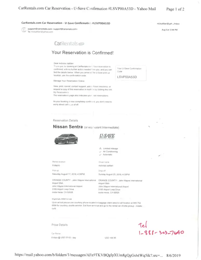 After coming back home I was unable to contact Car Rentals.com. because the customer service number provided on the Website for Car Rentals .com goes to American Arbitration Association for legal action.