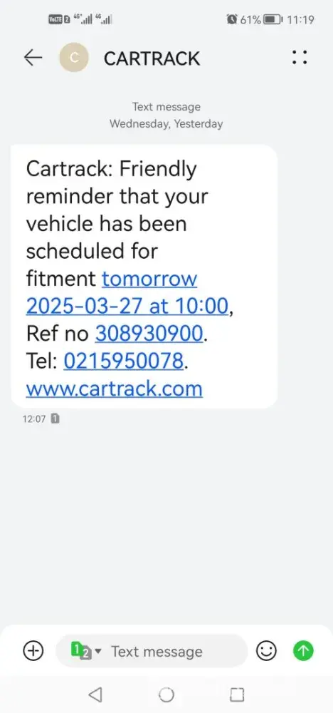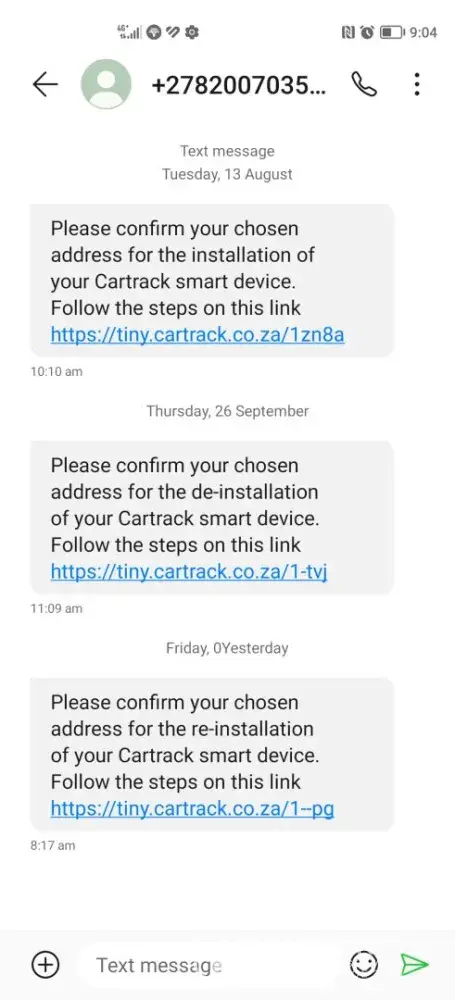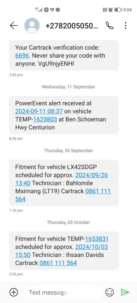 Still awaiting cartrack tecnician from 10h00 up to now 11h21 to install a device in my private vehicle at my house. The appointment scheduled was a waste of my time. Poor service from cartrack consultants after numerous calls whereby I could be given an answer why the tecnician is running late. Next I got a call from another consultant at 11h21 that the tecnician called me which ain't the truth.. The tecnician doesn't answer his call at all and I as the client being taken for a fool and a liar. Someone at cartrack is covering someone but I regret using their service. Cartrack is worse really
