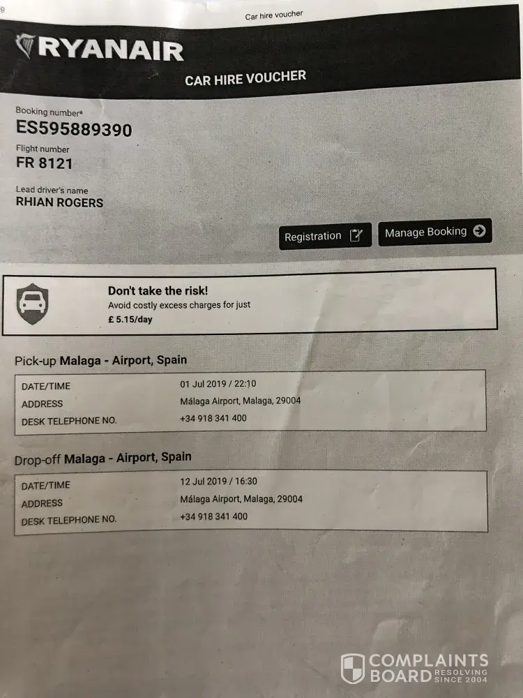 The issue that I have experienced was: My Husband and I flew from London Stansted Airport on flight FR2612 to Santander Airport on 26.07.19. We had pre-booked our car hire through Ryanair and was due to collect the car on our arrival at the airport. The car hire booking number is ES633811590.