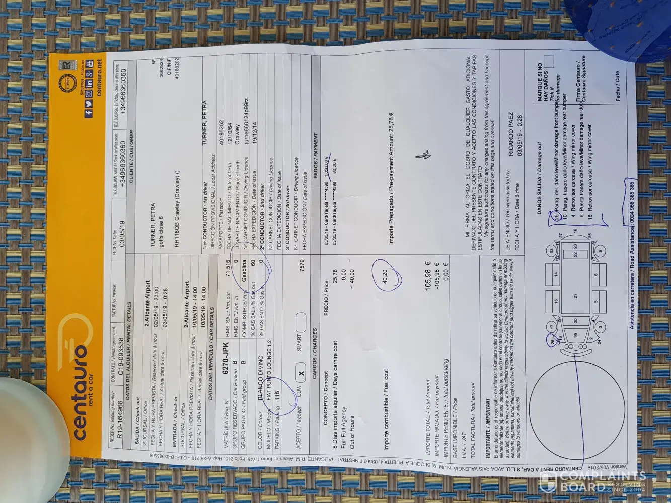 I would like the original contractual agreement to be honoured, and to return the 80.20 Euro that I was surcharged when collecting the car. I would also like a full apology for the way I was handled by the car collection agent. I make many trips to Alicante each year and I do not wish to have to go through this same experience again.