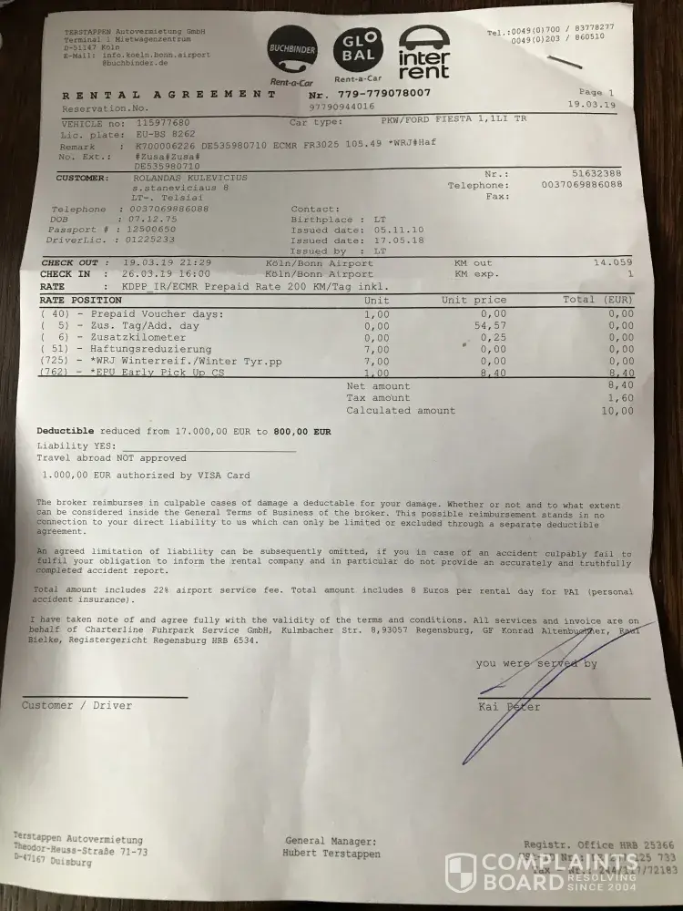 I have ordered a car for rent (car reservatuon no: DE535980710) via Ryanair (CarTrawler) company. I have read all rules, I also written flight no. in my order. I do not understand why your company stole 10€ from my bank account without any permission. Car has been delivered back after order on 26-03-2019 but money from my bank account have been taken on 28-03-2019. Because of this theft I will be forced to contact the police.
