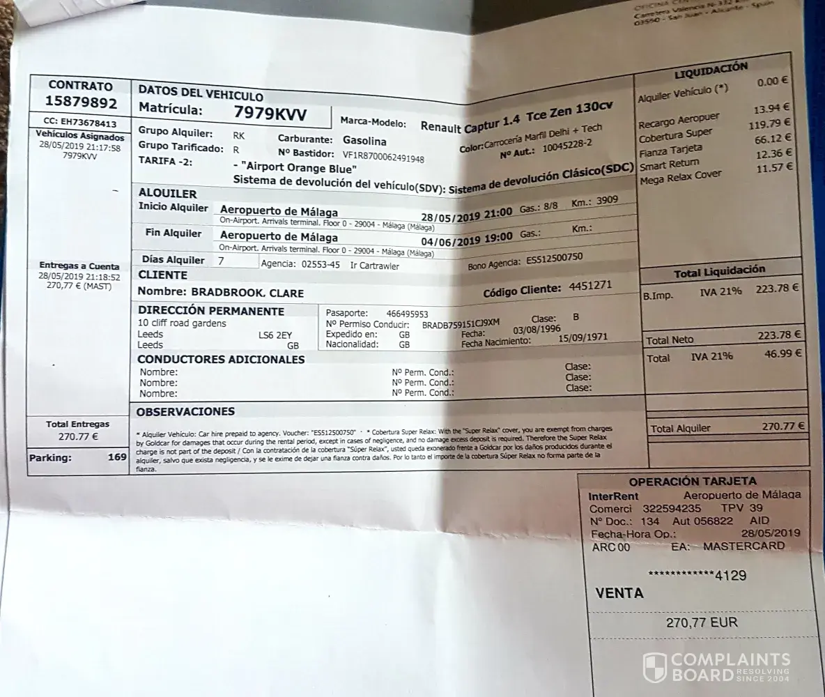 I saw an advert for a car hire for a week on CarTrawler, the ad stated that the price was all inclusive and there were no hidden charges. I paid the quoted price in full. At the Interrent Car Rental desk I was charged €270 more. I explained I had paid in full and bought my own excess insurance cover but the agent would not allow me to take the car without paying the charges . It was midnight in Malaga !