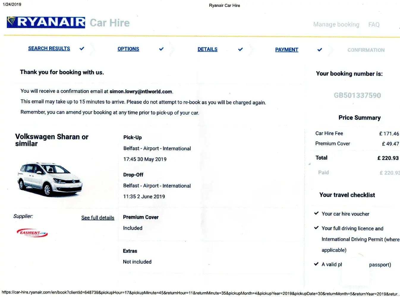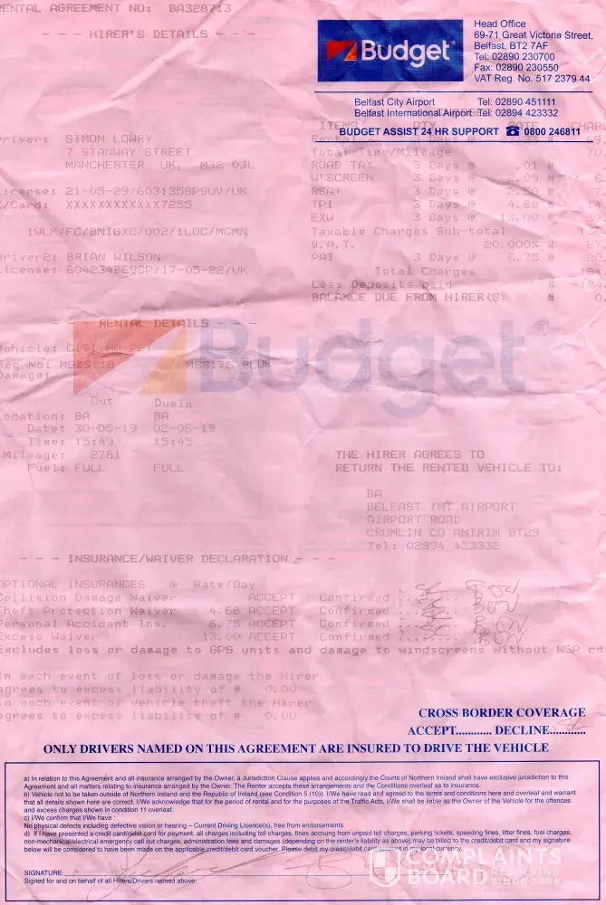 The issue that I have experienced was: I hired a people carrier through Ryanair Booking number GB501337590 from Belfast International Airport on 30th May 2019 with Easirent