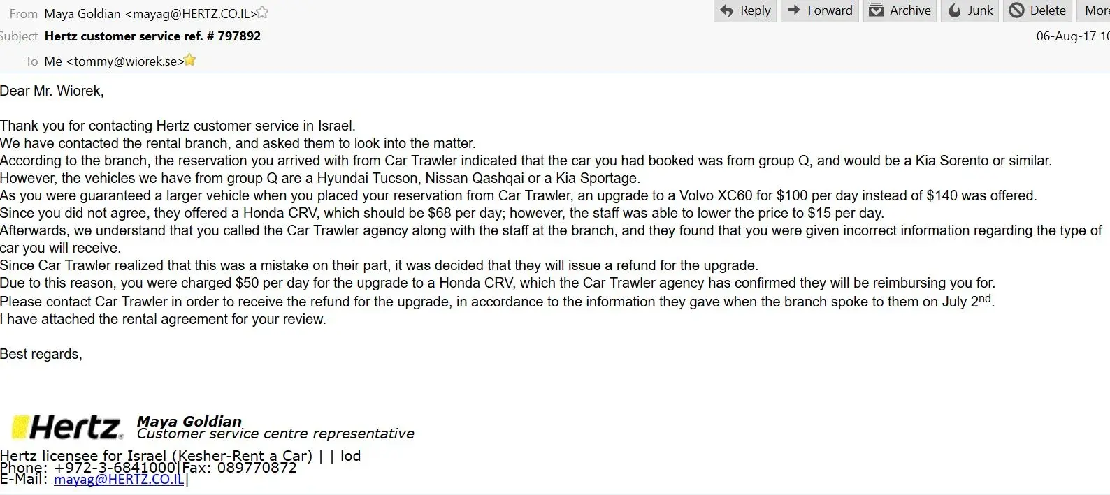 Please also see the answer from Hertz below that confirm that I am entitled to the refund promised by you! Also attached rental agreement.