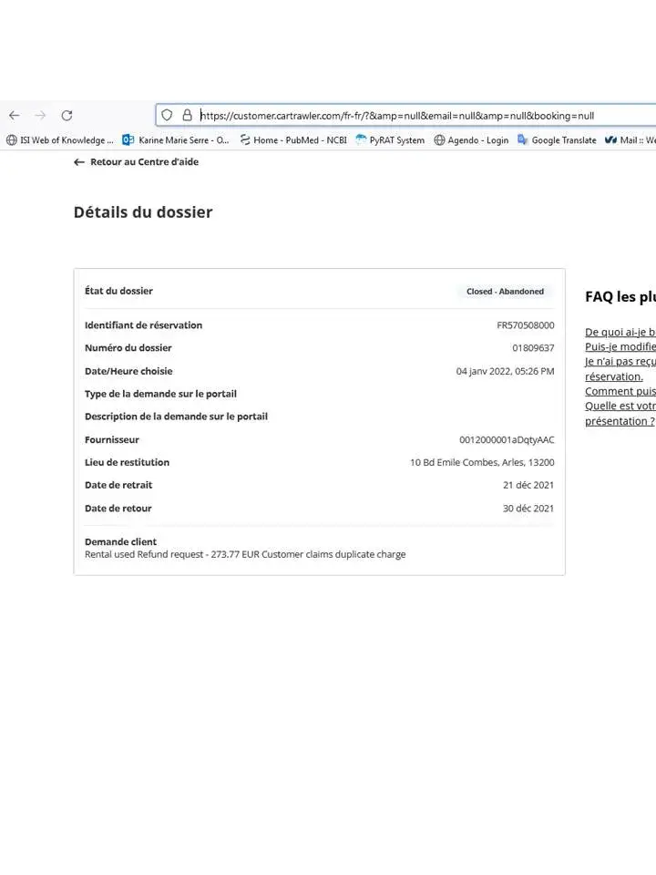 On the 04 janv 2022, 05:26 PM I reported this problem to https://customer.cartrawler.com, and the Claim reference is [protected] (See annex 4).