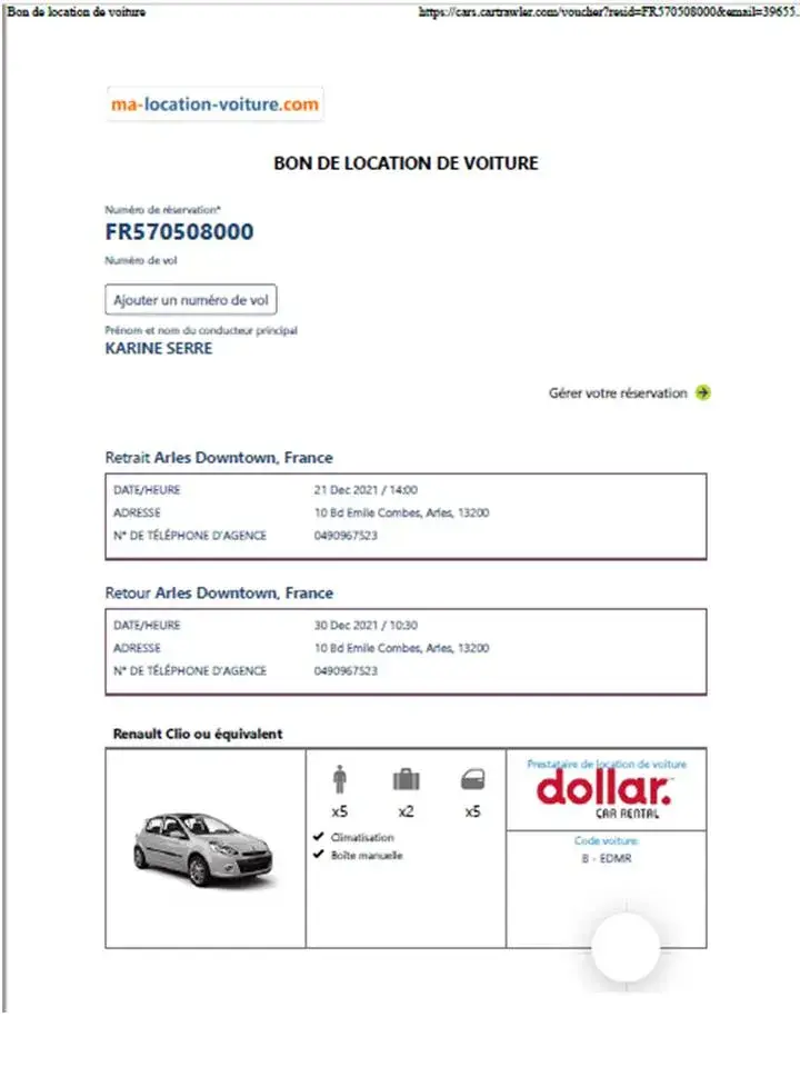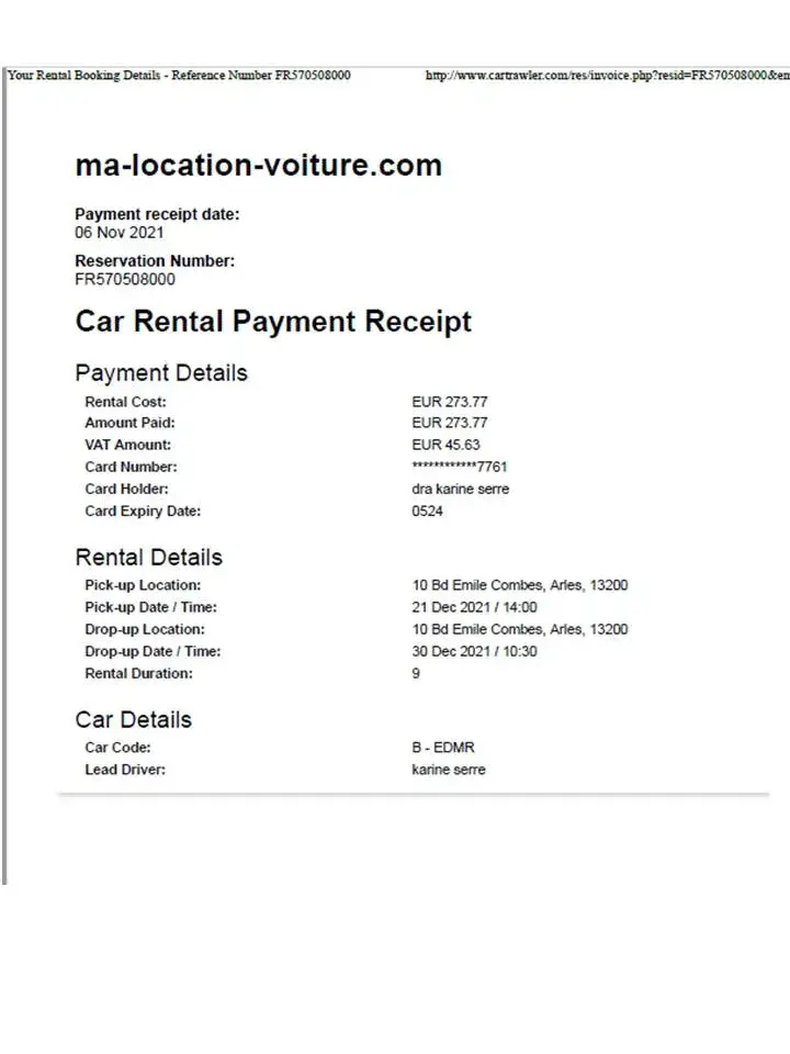 On the 06 Nov 2021, I rented a car through the website: www.ma-location-voiture.com, with the reference: FR570508000 (See annex 1). Of note, this website is in fact run by https://cars.cartrawler.com and appears debited by CARHIRE IRL.