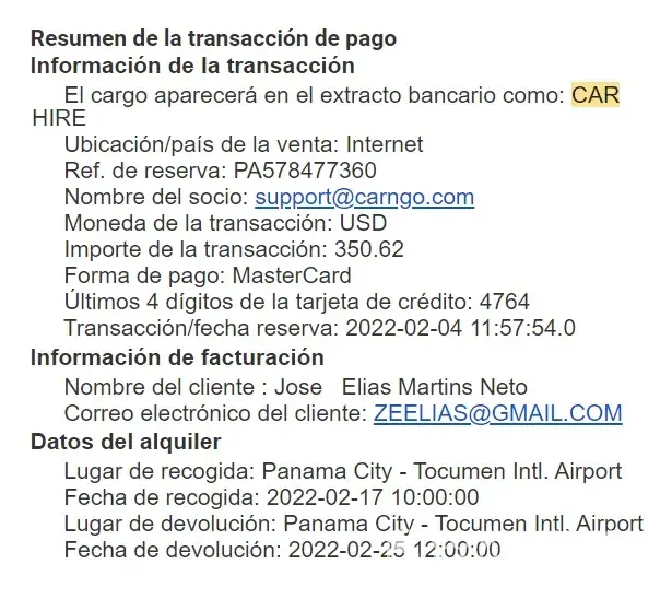 2) Car rental confirmation where it appears “Payment received†(Annex 2)