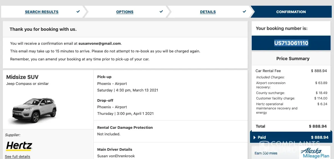 Please find attached screenshots of what I was working with in today's booking attempt. Again, Hertz shows the full voucher amount being applied and the other's only $1. When I proceeded to purchase what showed to be a booking for $491.94; once I hit confirm the amount changed to $888.94. I have contacted my credit card company and canceled the $888.94 charge. I have also called Alaska Air and shared my very disappointing experience. I have lost track of how many days and hours I have lost trying to book with this company, it has been extremely frustrating.