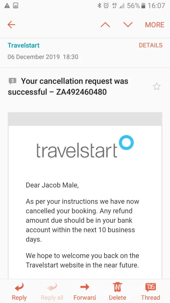 on Tuesday the 28th I phoned Hertz to cancel (car hire company) and they advised that i need to contact Cartrawler to cancel since the booking was through them. they gave me some Cape Town number which did not work.