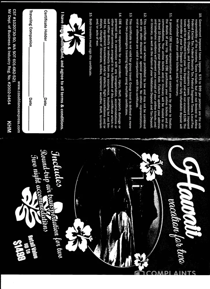 Please contact me. I do not understand your complaint. Casablanca does not book flights with 2 stops?, does not use the EZ8 motel?, and does not require a 3 hour seminar to utilize the travel certificate. Again, please contact me, if you have a Casablanca travel certificate, I will make sure you receive the benefits.