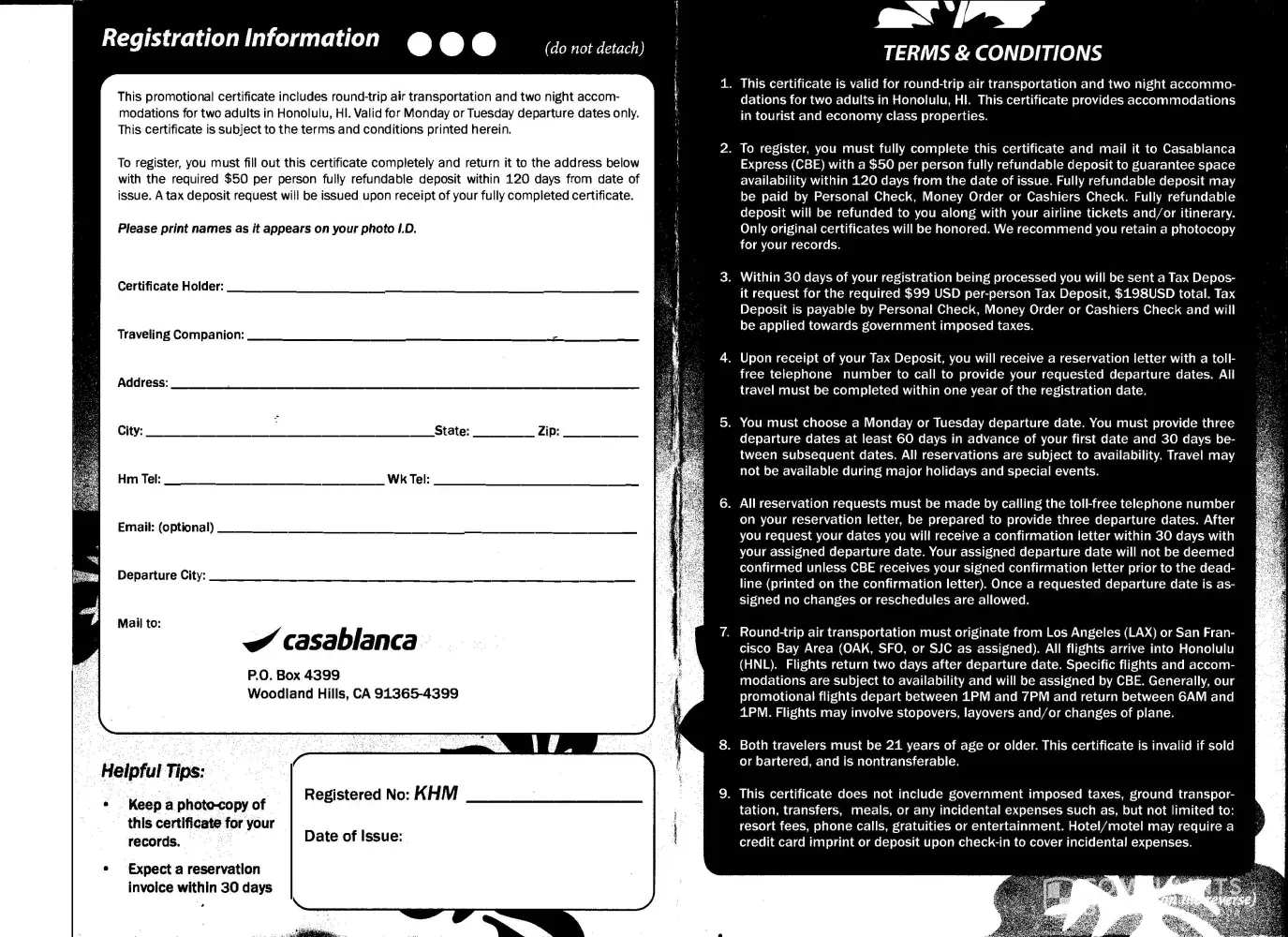 casablanca is a scam operation. we tried to do this twice. They never honored the trips. They delayed and delayed until the year was up. They said we did not take the trip within a year and they would not honor the contract. Thien after several years we get a notice saying that we could go on our trip?!?!? Only if we sent them more money?!?!?! Are you kidding me!?!?! Scam on me once shame on you, scam on me twice, shame on you. Expecting me to spend more money, NO, the third time would be scam on three times shame on me.