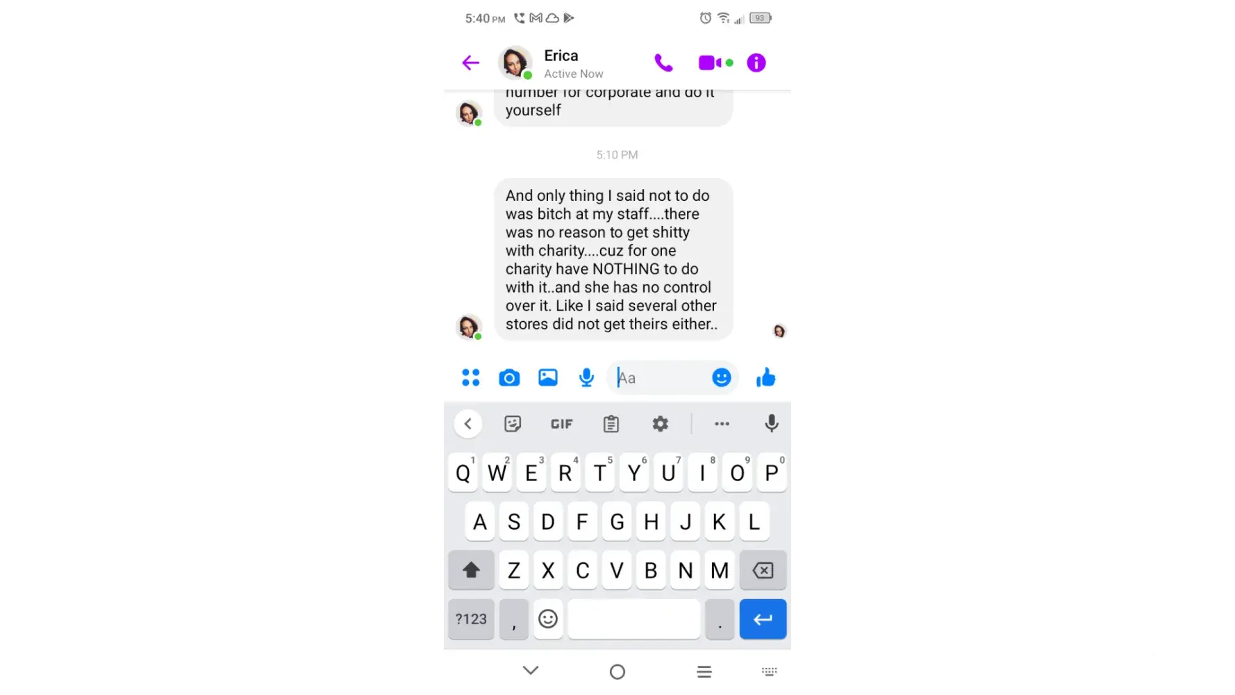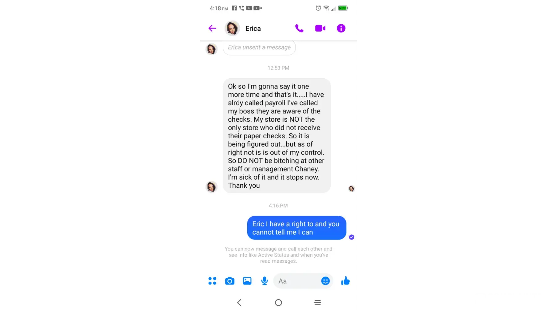So problems didn't start till my third week. She had hired me and discussed pushing a younger guy out because he was disruptive. More recent my check was late because it was a paper check my bank was having issues and I couldn't use them for direct deposit. She knew the mail would be late so I had asked if she would call corporate to make sure it's on it...