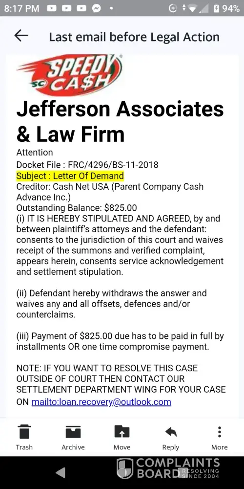 Read full complaintEmail threats and intimidation to pay cash advance
