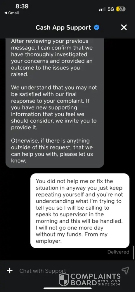 We have notified by mail "Cash App" headquarters (1955 Broadway, Suite 600 Oakland, CA 94612) with a detail letter of our plight with their "Tech Support", our dissatisfaction with the very, very poor service, unhelpful and untrained employees. As you can see the money remains unprocessed because of the facts stated above,