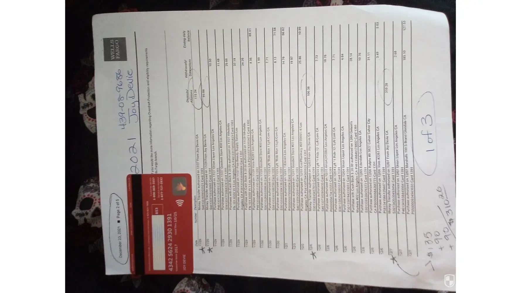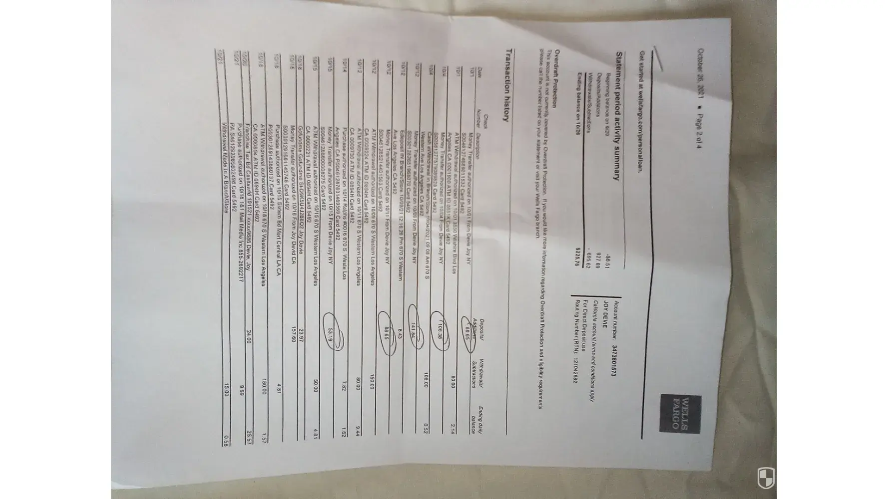 Please see attached October, 2021 Wells Fargo bank statement. The amounts are after Cash App takes its fee.