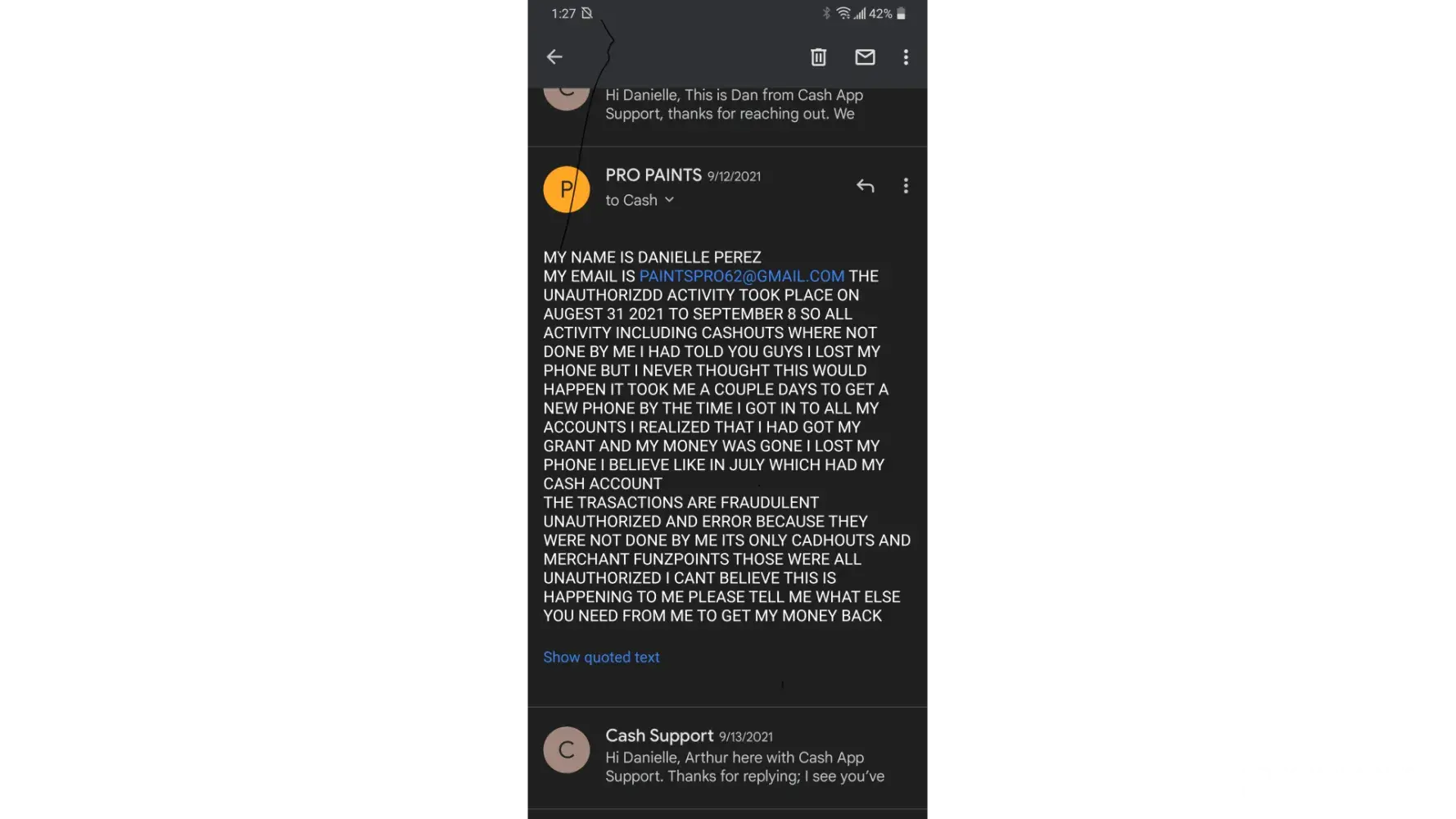 I have my work paychecks direct deposited to my cash app account. On Friday 9/30 my check was deposited I paid a bill and about 30 minutes later the remaining $1,100 was sent from my account to an unknown user. I did not receive a text message notifaction or cash app notification like I usually do only an email. Cash app customer support is horrible I want to speak directly to someone who made the decision to close and deny my claim. This is the worst customer support ever. Also had an $85 unknown transaction denied never had time to follow up or run around with their emails instead of speaking to their customers. I worked two weeks for mt check I need it case#