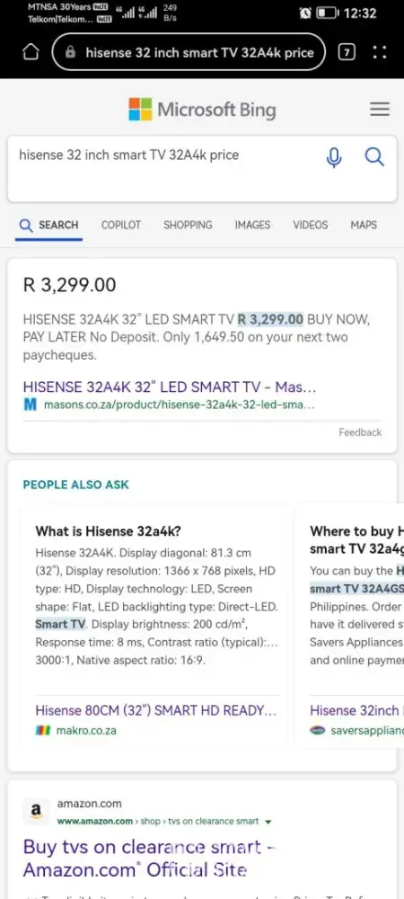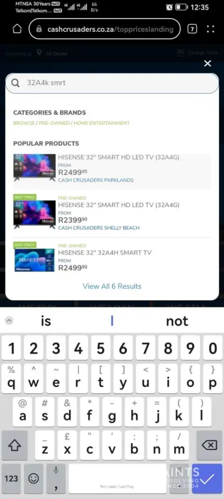 I have selected to sell my TV a brand. New hisense smart TV model number is 32A4K 32 inch. And I did my homework before selecting the store and I checked brand new price for the TV and I further went on and checked cash crusaders selling prices as well I discovered my TV brand new is selling for R3299. 90 and second hand value is R2300. 00 and R2500. 00 on...