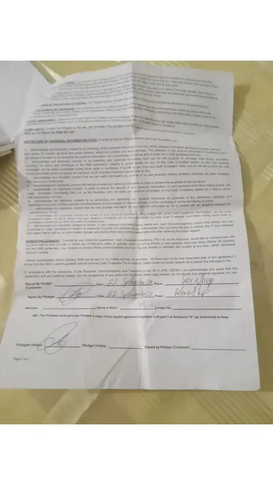 I went to Cash Crusaders on the 16th of December to get both items back on the loan that was done. I was told in October 2022 Raslouw had a robbery and that only the one item was still there (it was a Samsung Galaxy tab). On the one item I have paid in full and got it back. On the N71 Samsung phone I was told not to pay yet and I have to come back to the shop on the 31st of December.