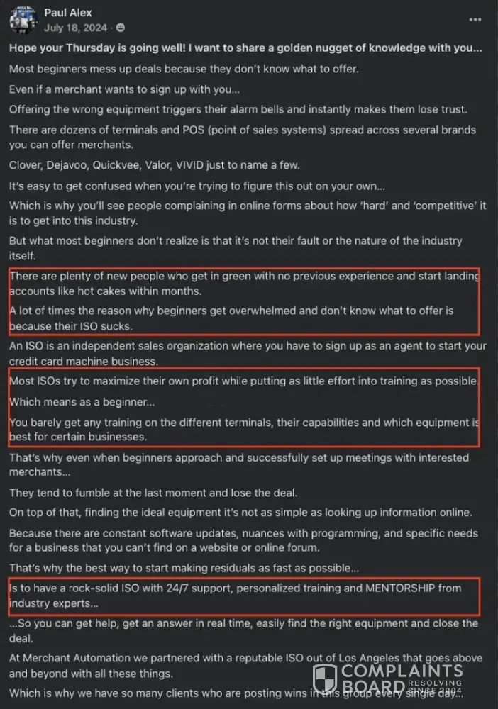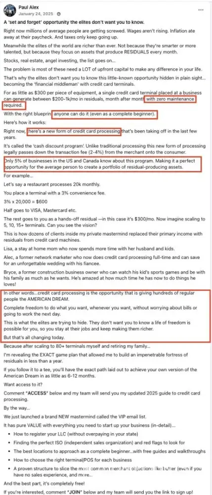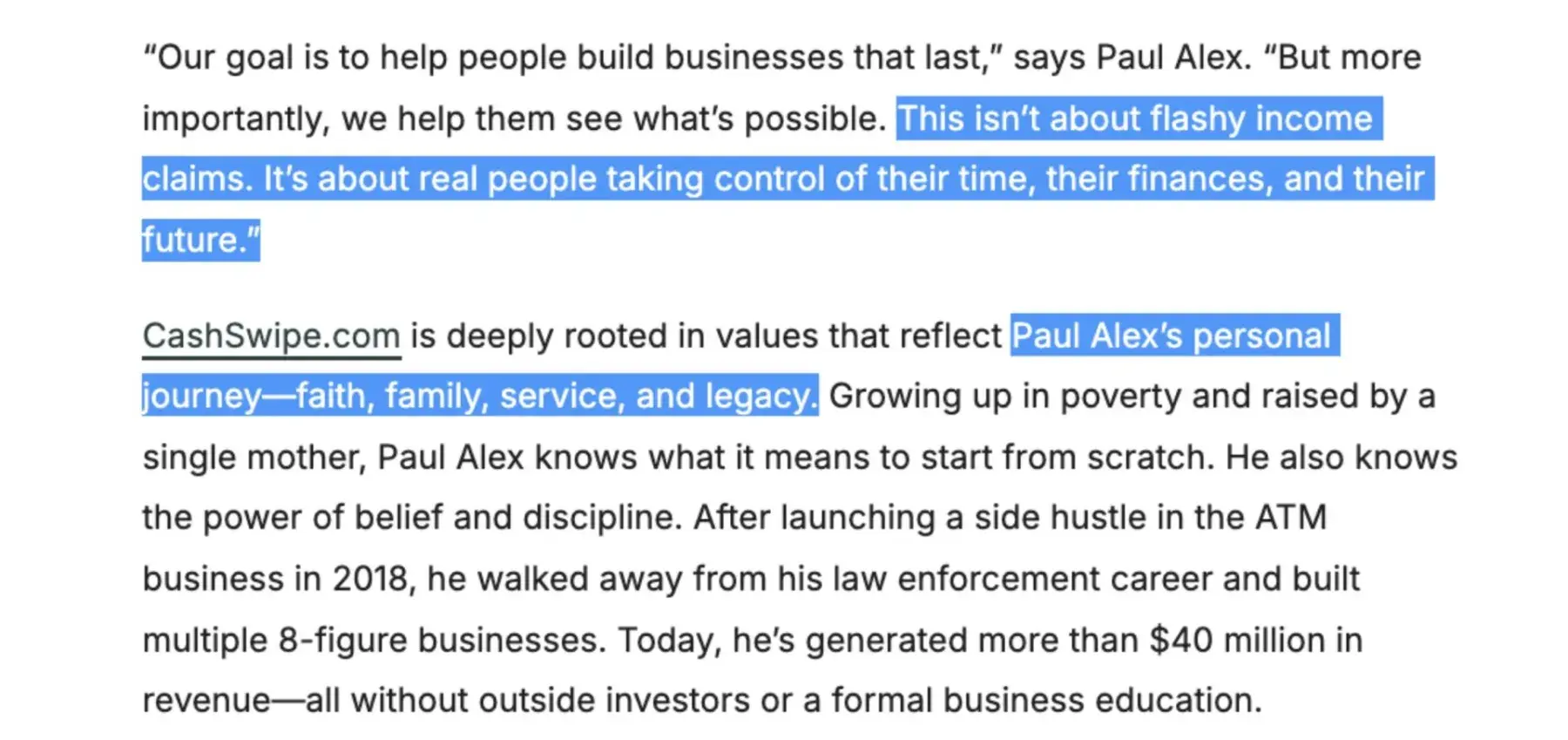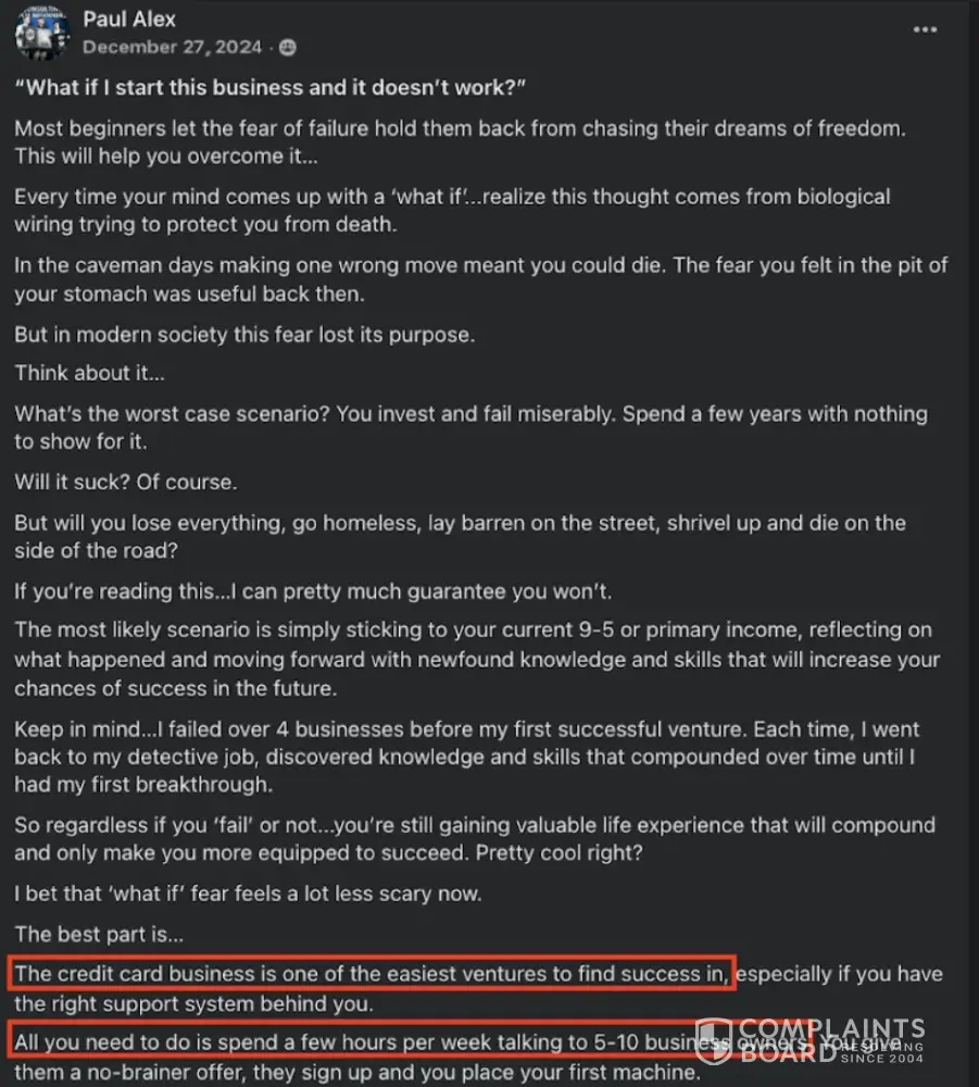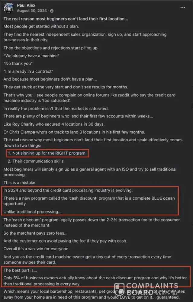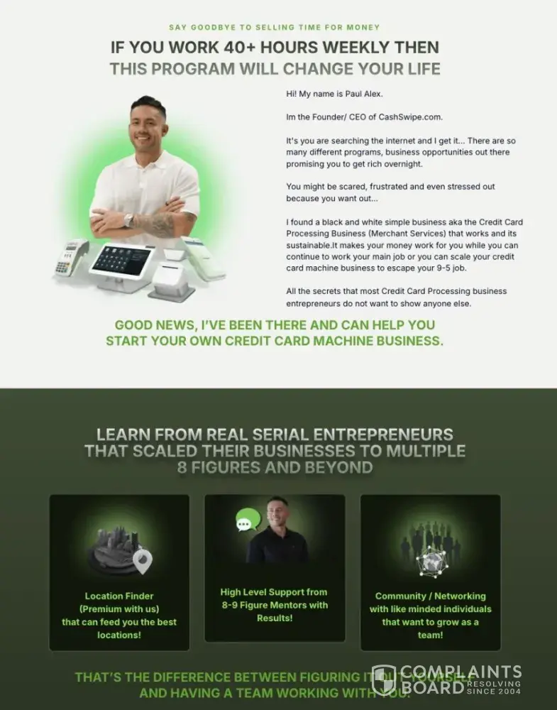 Paul Alex Espinoza (@paulalex, Founder of Cash Swipe), his sales team, and his partners at Paybotx knowingly scam many out of tens of thousands of dollars to this day, selling an elaborate "done-for-you", "100% passive" income business opportunity since 2023. They have systematically deceived people of expected results, incentivized positive review...