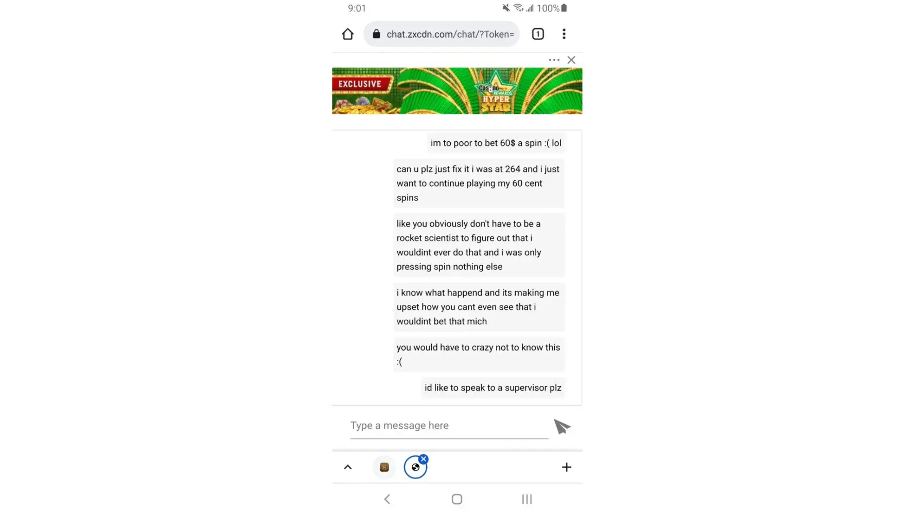 N to lure u in and not even honor the promotion they send u...you are then accused of exploitation. That's some fake excuse to not give me the slot money that should be mine without question.