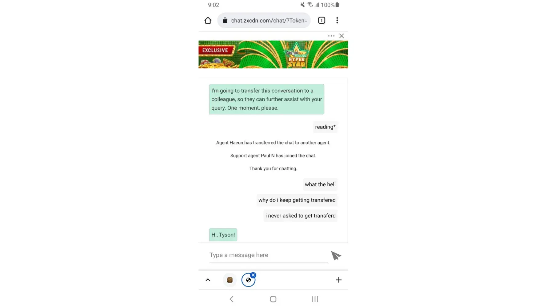 thank you for giving me more proof against what you've been doing to me for the last 15 years casino rewards. The amount of money that you guys have taken from me is one thing, but in the last 3 years the amount of cheating and game rigging that you have pulled on me, now I know how you have done it. had I not heard your Australian accents through my phone while I was playing and discussing that you were not going to pay out my win that I just got and laughing about it, I would not have known this is how you guys were cheating. so thank you for letting me know exactly how you guys were getting away with cheating me all this time.