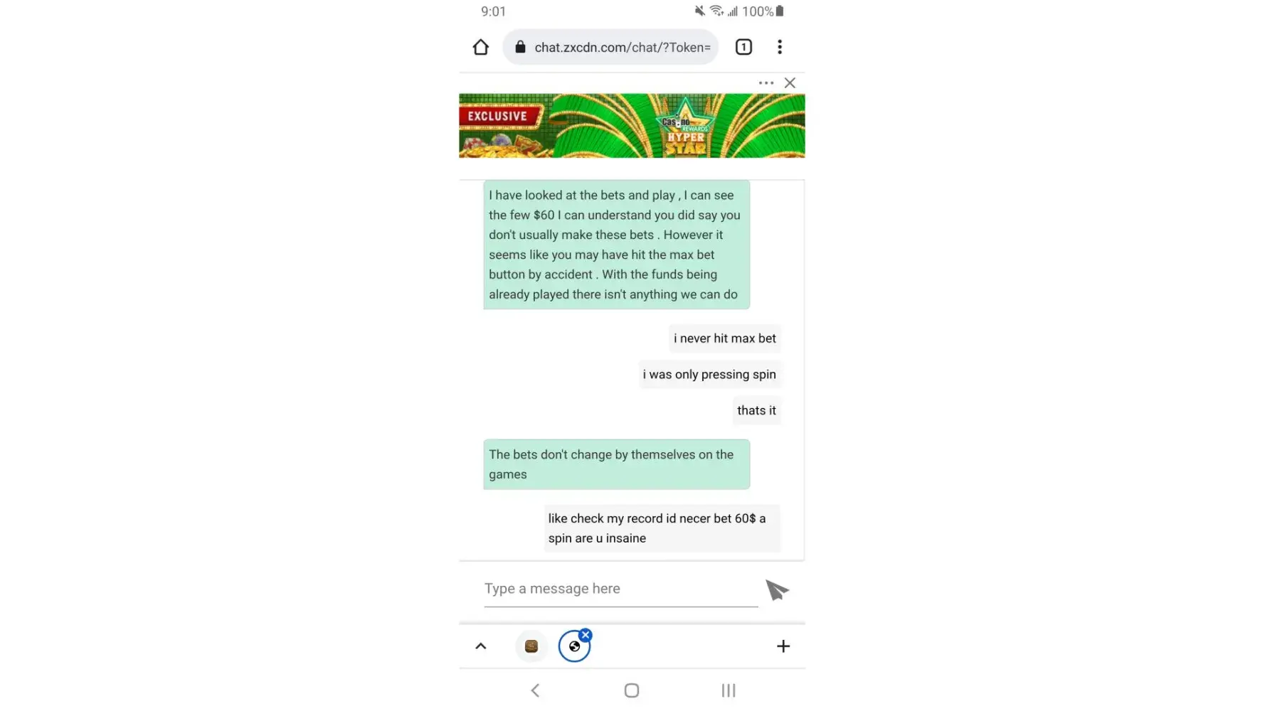 I was playing normal 60 to 90 cents winning upto 294$ then as i am spining the bet changed on its own to 60$ per spin without notice and then i contact support 1 min after not noticing it untill it said insufficient funds. spined like 4 times . told them what happened and they said i switched it or pressed max bet when i never did. and they cant do anything.