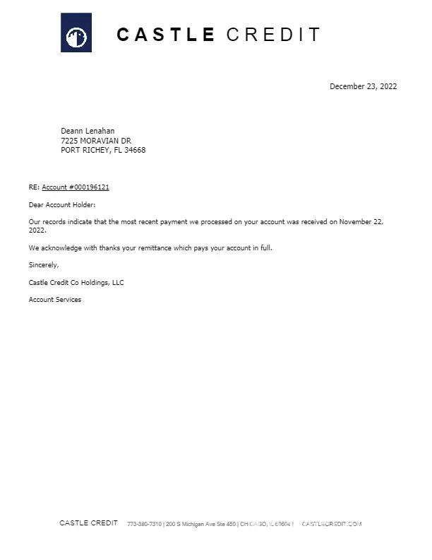 Castle Credit Co Holdings Paid account in full and castle credit filled a lien against our house 5 days afterwards.