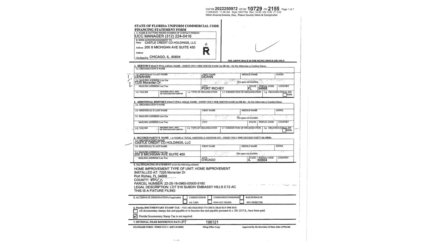 Desired outcome: Receive letter of Satisfaction from Castle Credit have it submitted to the Pasco County Clerk to remove lien on our house ASAP.