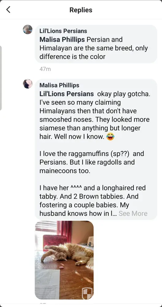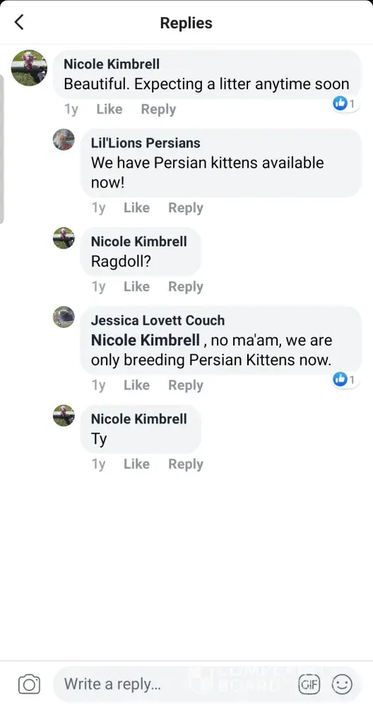 Everyone looking 2 get a purebred persian kitten. beware of people from alabama, mississippi, wisconsin, n louisiana. mixed bred. jessica lovett couch of lil lion persians. she's a very deceiving woman. if you or anyone you know bought a cat from her. look at this. she had 1 ragdoll bred 1 long haired cat. called 1 of the kittens pickles then bred a half...