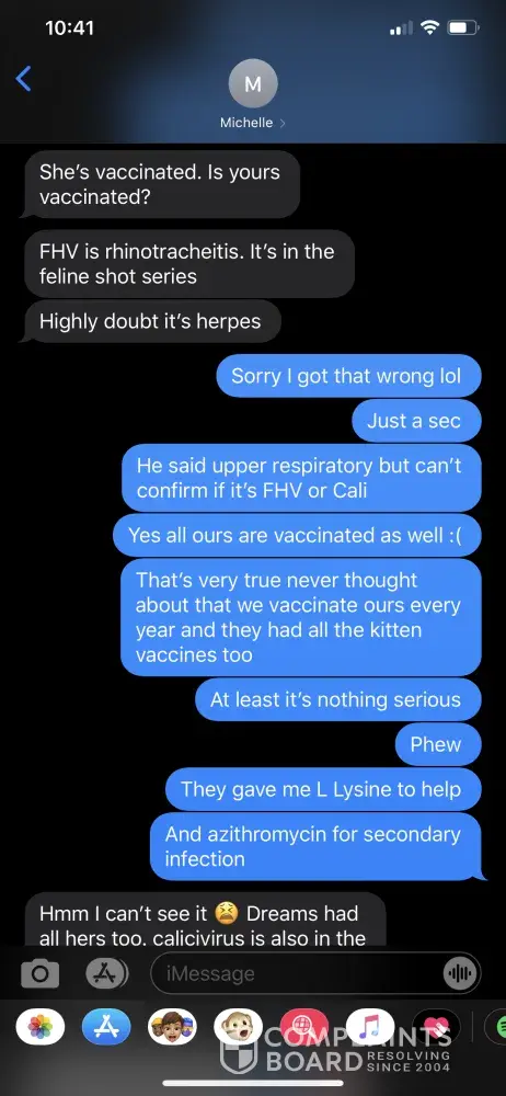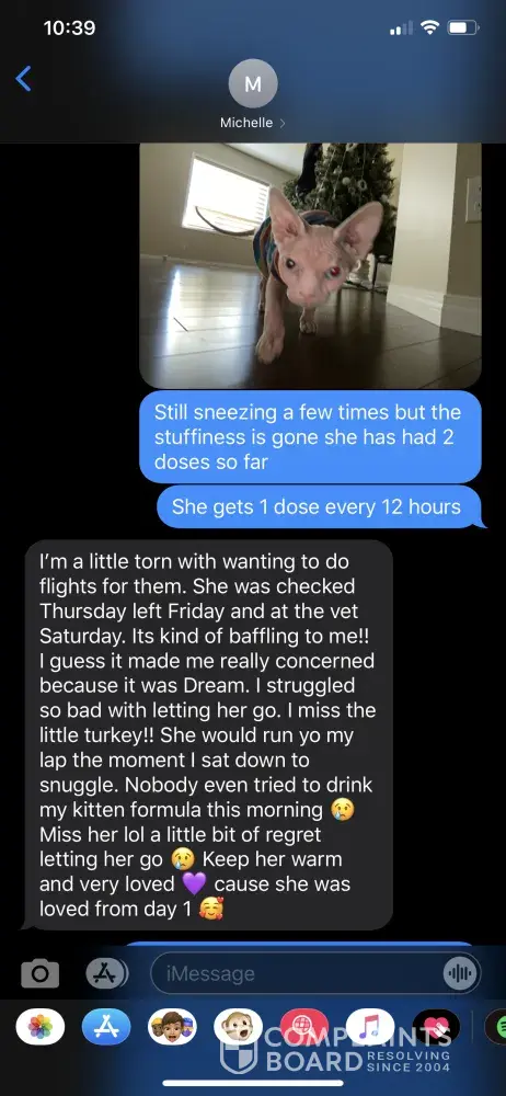 To whom it may concern: I paid fully not knowing that what I paid would be non refundable till after the fact and never paid a deposit which I should have not had to pay the full amount and its been over two months and never contacted me to tell me the situation with the cat, never once contacted me after I paid. I had to contact them. She keeps telling me...