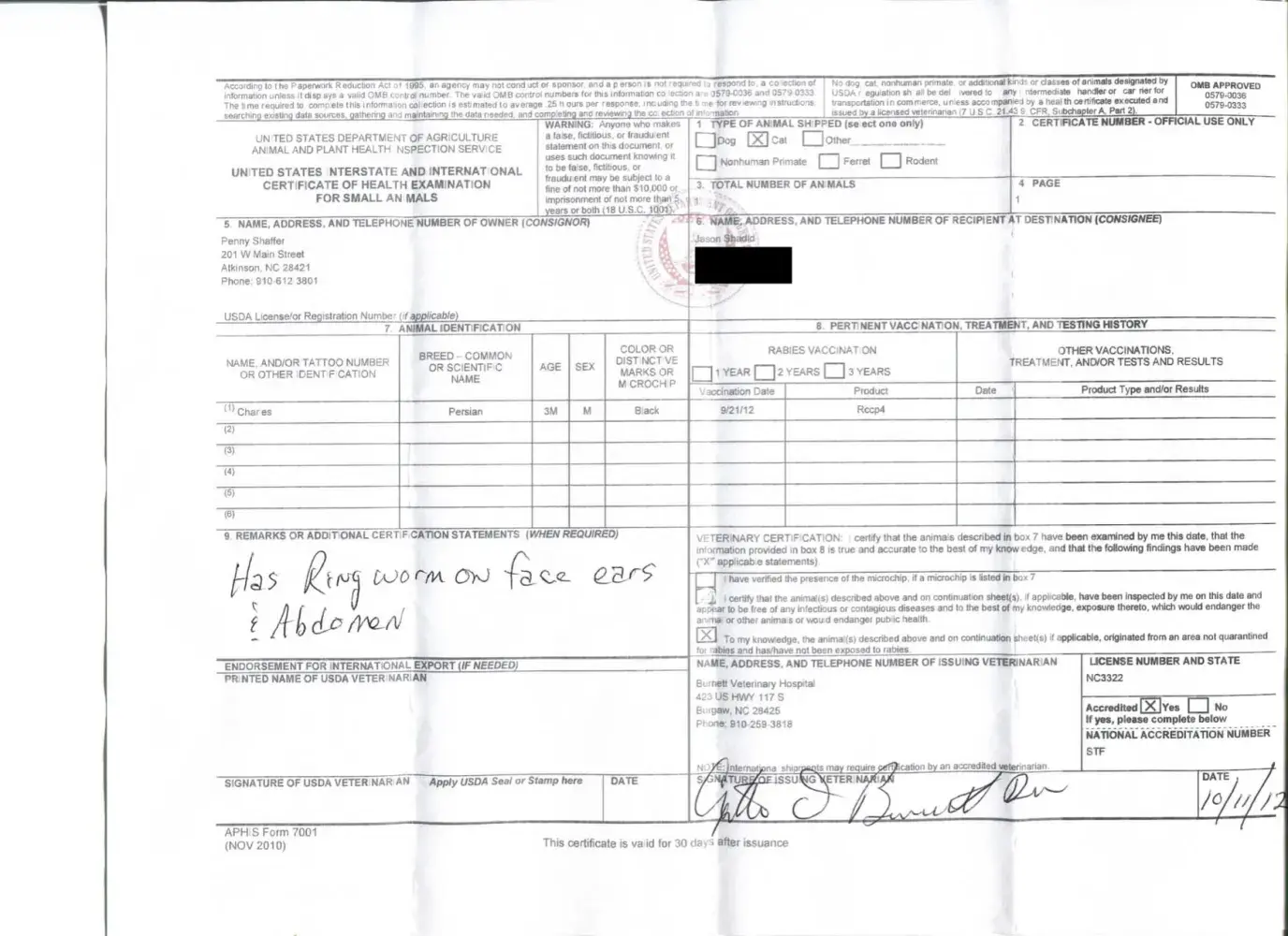 Purchased a kitten who came with a health certificate and supposed vaccinations. My kitten came with antibiotics the breeder claimed was from a /Mild respiratory infection. Took my kitten to the vet the following day and the vet ran an extensive blood panel stating he was afraid this kitten was very sick. The results showed my kitten had FIP, FCV, and wa...