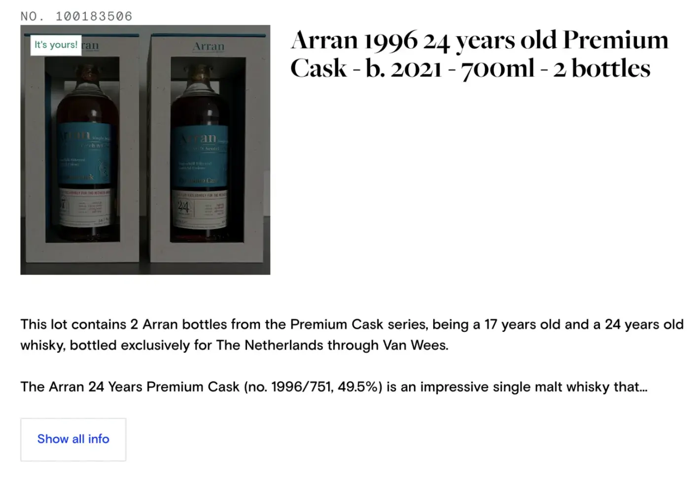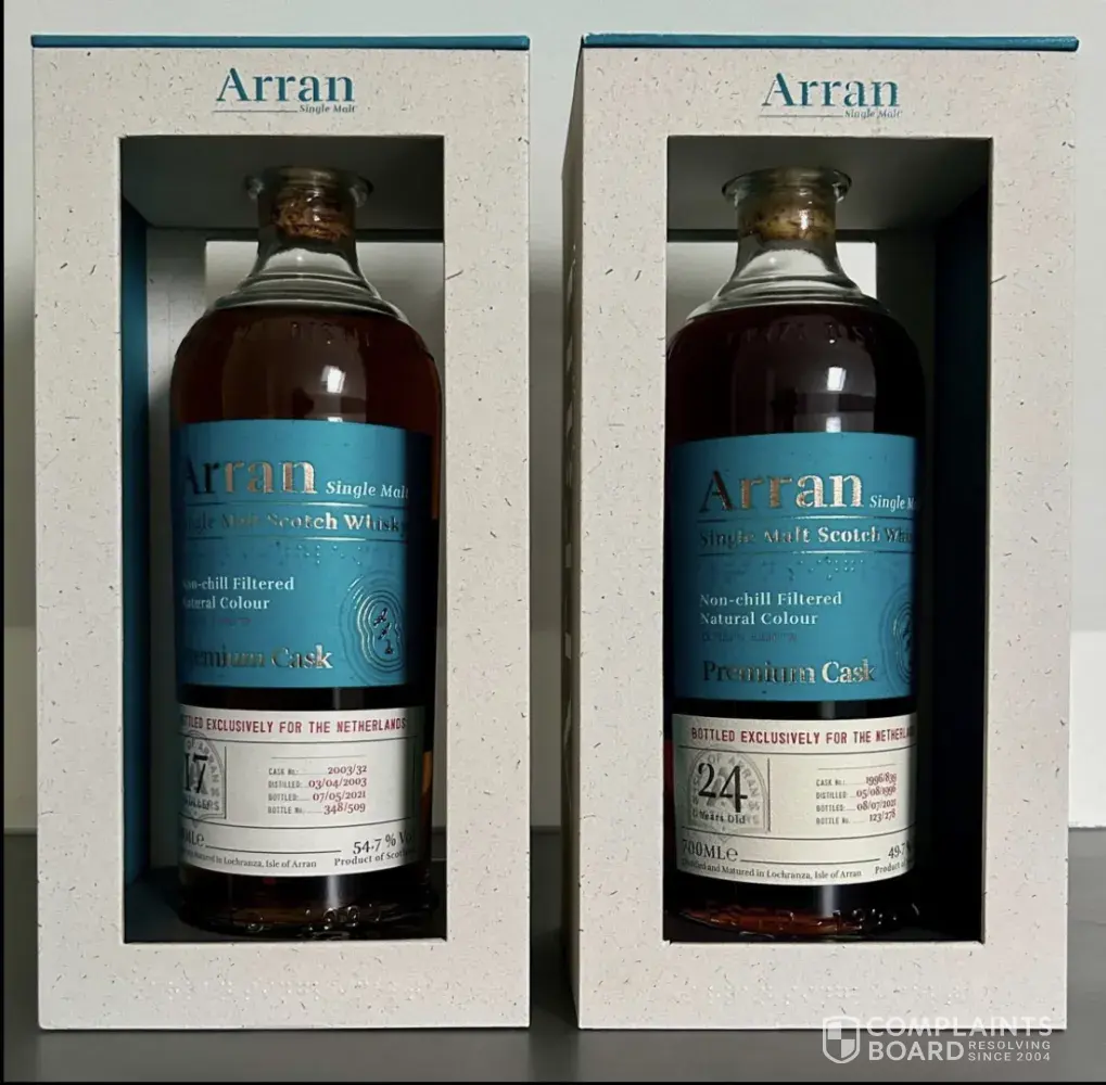 I won a lot that had written in its title the following: "Arran 1996 24 years old Premium Cask - b. 2021 - 700ml - 2 bottles" and nothing else. It turned out that the lot was selling one 24 y/o bottle and one 17 y/o bottle which clearly was not described in the headline but in the smaller print of the lot description. To add to the deception, both bottle...