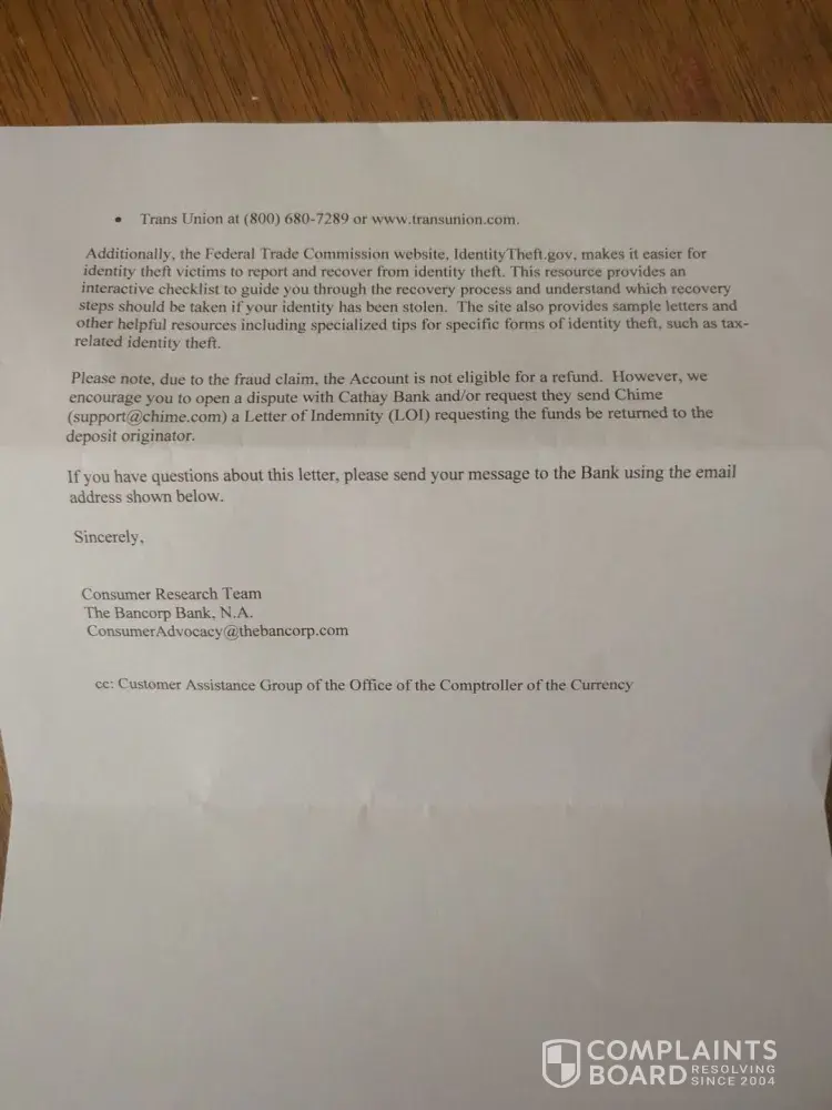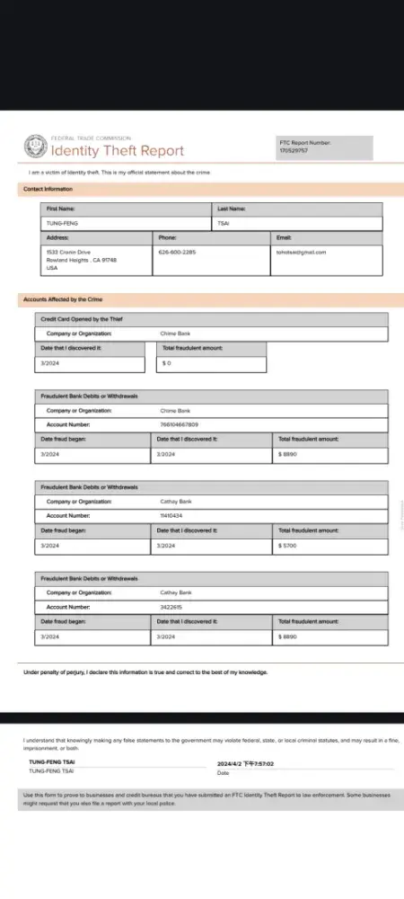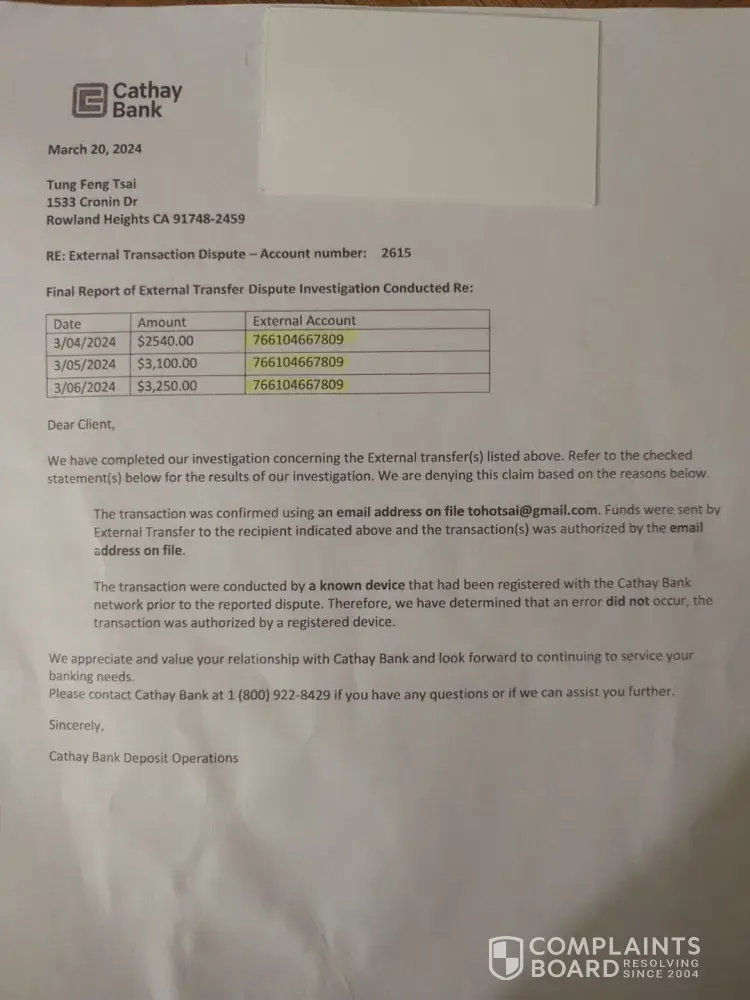 There were three unauthorized transfers from our bank account (Cathay Bank) to another account. On March 4, 2024, $2540.00 was transferred to a Chime Bank account. On March 5, 2024, $3,100.00 was transferred. And on March 6, 2024, $3,250.00 was transferred again. When I applied for an External Transfer Dispute Investigation on March 07 2004, Cathay Bank...