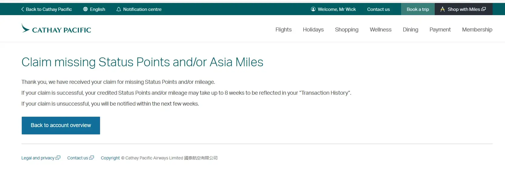 Claiming of missing status miles points CX 383 from Hong Kong to Zurich