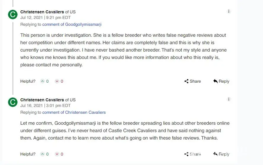 This complaint is not about the breeder Cavalier Companions based out of Roseville/Grass Valley, CA. Shelby, the owner is a different breeder than what the person who registered this complaint is referring to. Please read all the replies and reviews carefully and don’t assume that the complaint is for Shelby at Cavalier Companions.