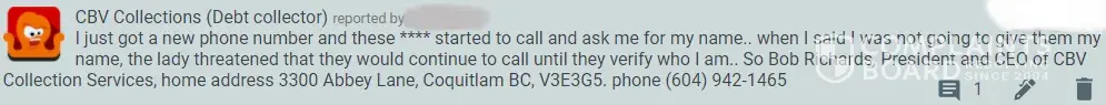 BOB Richards President/CEO of CBV Collection Services, Home address 3300 Abbey Lane, Coquitlam BC,V3E3G5 phonne number [protected]