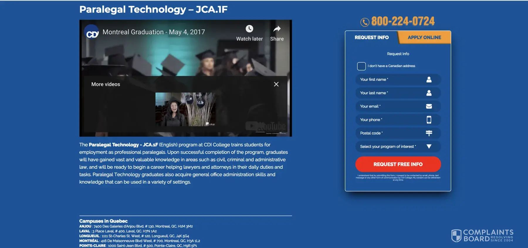 On February 18, 2019, I was looking into schools who offered a paralegal technology program and came across CDI college because they were the first to pop-up on my Google search page (props to their web team for having really good SEO). So I went to their website and there was not much information except for a basic description of the program, a basic "what our grads say" section (which doesn't give much either in terms of credibility. Anyone can easily just slap a quote and a name.) and then they had the little "request info" form that was permanently stuck on the screen no matter where you scroll.